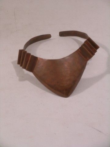 From various theatrical productions and History Channel's 'Conquest' series, this is a copper neck/choker ornamental piece. The choker is likely hand-made from a sheet of thin copper with a ribboned design. (measures approx. 7" long)