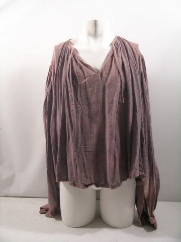 From various theatrical productions in England and the History Channel's 'Conquest' TV series, this is a brown 'peasant' style shirt. The long sleeve shirt is fashioned from a thin cotton material and dyed brownish-purple. The shirt has a low cut front with drawstring. Shows some fading in certain areas.