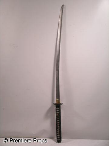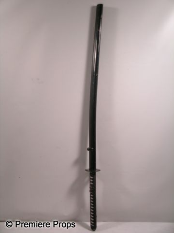 Used on the History Channel's 'Conquest' TV series for the 'Ninja' episode, and various theatrical productions, this is a full size Samurai sword and scabbard. The tempered steel sword blade is still somewhat sharp and is affixed to a thick white plastic handle, woven with cloth strips for better grip. Comes with black lacquer painted wooden scabbard. (measures approx. 43"). Oversized item. Additional postage required.