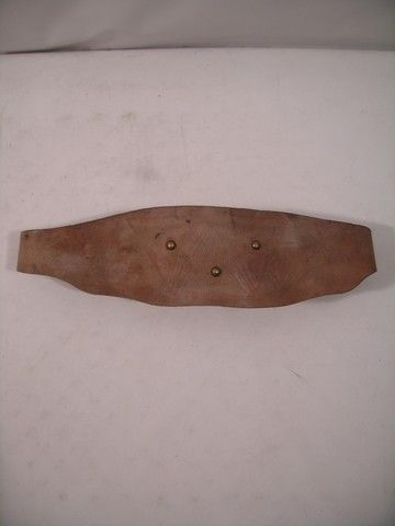 From the History Channel's 'Conquest' series, this is a leather 'stomacher' belt. The belt is made from tan leather with three steel rivets on the front, and a brass belt buckle for attachment. Has 'W' written in ink on inside of belt. (measures approx. 48 1/2" long)