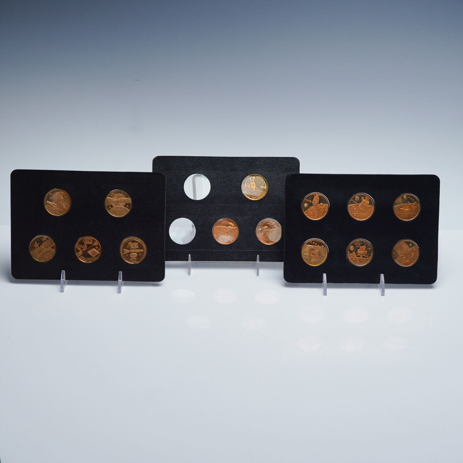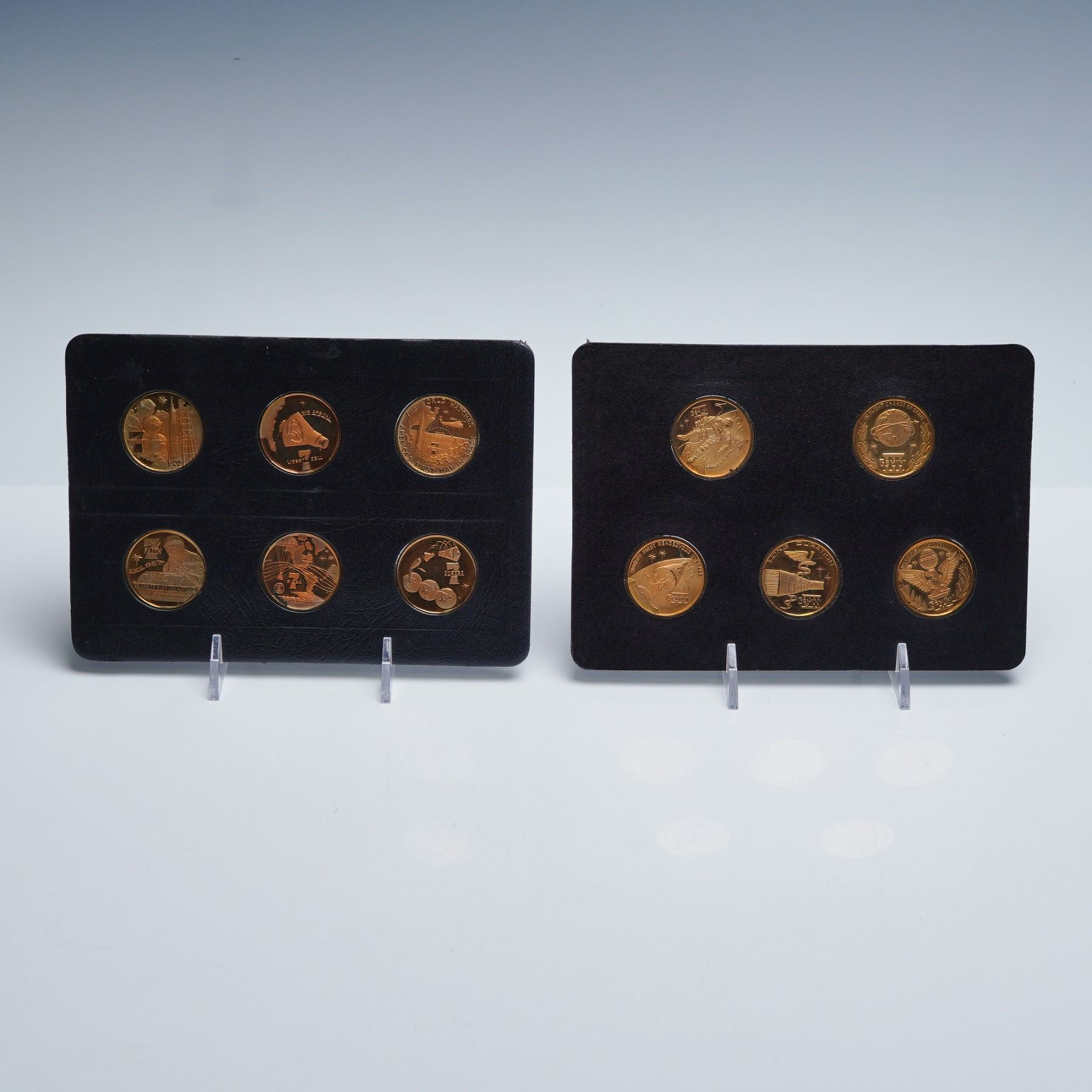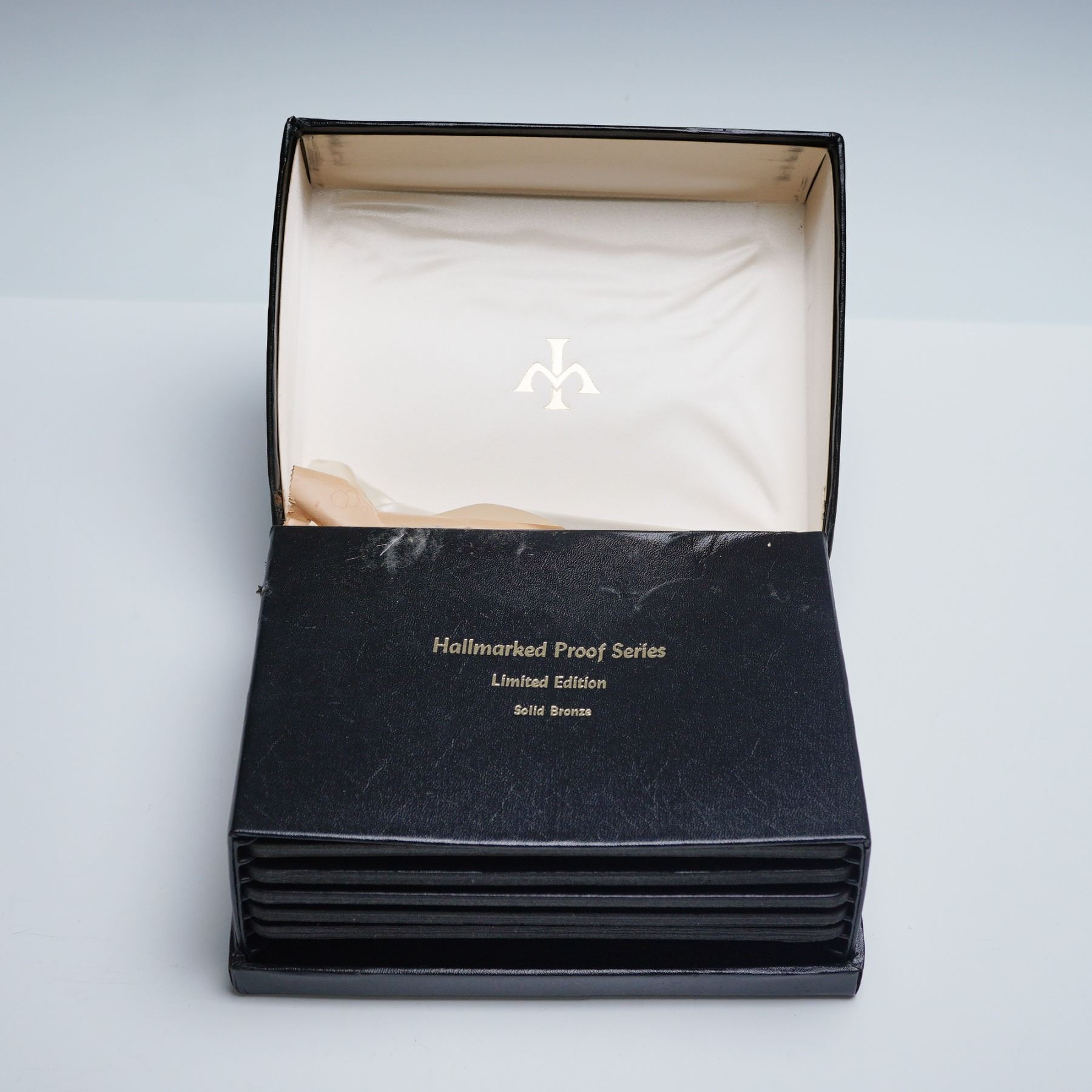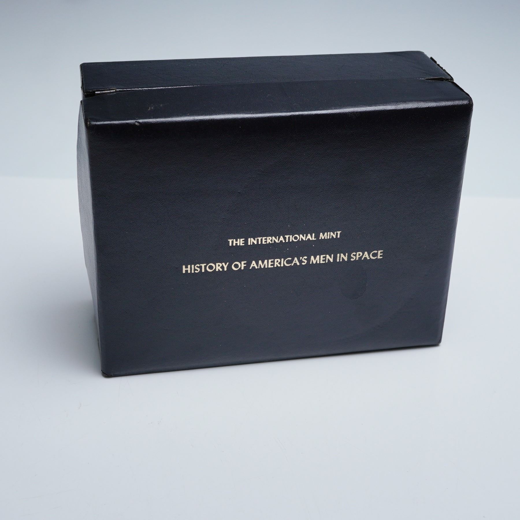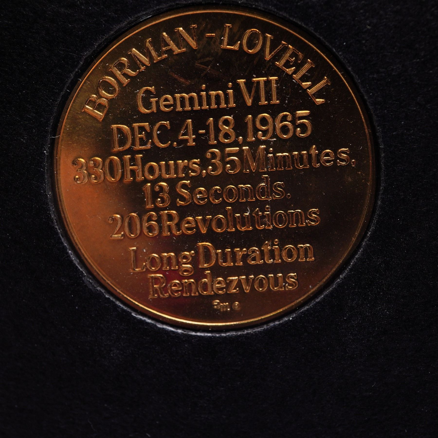 A limited edition solid bronze medal collection titled History of America's Men in Space, produced by the International Mint as part of their Hallmarked Proof Series. Housed in its original padded case, the set includes multiple proof-quality bronze medals mounted on five display panels. Each medal commemorates a key milestone in the United States space program, featuring finely detailed engravings on both sides. Notable subjects include missions from the Gemini and Apollo programs, such as Gemini VII with astronauts Borman and Lovell, launched December 4, 1965, and documented for its 330-hour long-duration flight and rendezvous. A striking and substantial collection honoring American space exploration history.