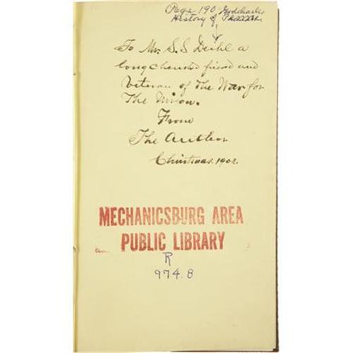 <B>[William P. Lloyd]. </B></I><B><I>History of the First Reg't Pennsylvania Reserve Cavalry,</B></I></B></I> <B><I>From Its Organization, August, 1861, to September, 1864, With List of Names of all Officers and Enlisted Men Who Have Ever Belonged to the Regiment, and Remarks Attached to Each Name, Noting Changes, &c</B></I></B></I><B>.</B></I> Philadelphia: King & Baird, Printers, 1864.<BR><BR>First edition. Inscribed by the author on the front free endpaper. Twelvemo. 216 pages.<BR><BR>Original brown cloth with decoration stamped in blind on the front and back boards and titles in gilt on the spine. Titles tarnished. Spine slightly faded. Light shelf wear, mainly at the corners. Contents tight with minimal toning. Large red library stamps on the front pastedown and front free endpaper with inked Dewey decimal numbers. Three or four smaller red ink library stamps at the head of a few pages in text and on the lower and upper edges of the pages. Still a very good copy.<BR><BR>A superb record of this Pennsylvania cavalry regiment which includes rosters of personnel with information of promotions, desertions, and the regiment's killed and wounded.<BR><BR><BR><b>Shipping:</b> Books & Catalogs (<a target="_blank" href="http://www.heritageauctions.com/common/shipping.php">view shipping information</a>)