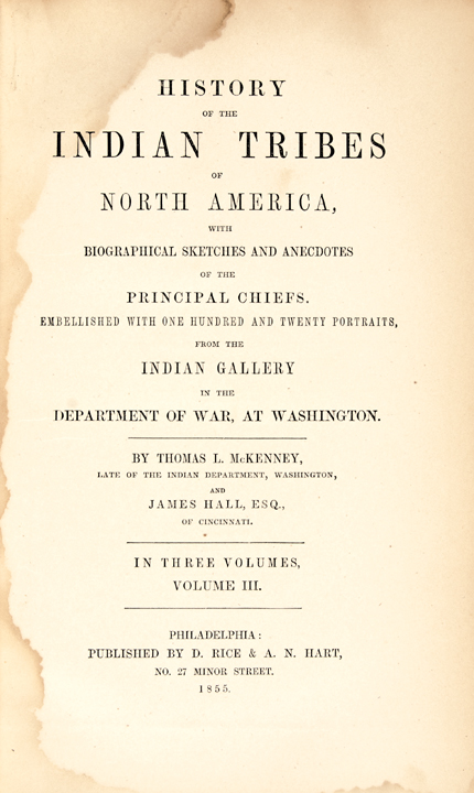 “History of the Indian Tribes of North America”, 3 Volume Set, containing 120 Hand-colored Portrait Images of Native Americans by McKenney & Hall. Rice & Hart imprint and date of 1855 on the Title page, Reprinted from the 1836-38-44 Folio edition, Very Fine.