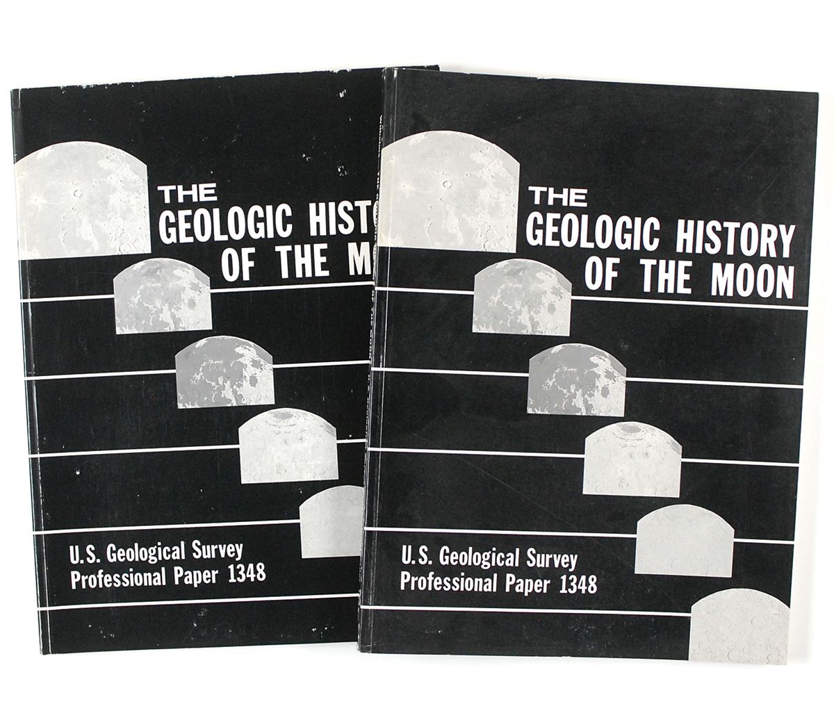 Two copies of The Geologic History of the Moon, 11 x 14.5, 302 pages, printed by the United States Government Printing Office in 1987. Books are full of pictures and diagrams of the lunar surface, moon rocks, and reports from the Apollo lunar missions. Each book also has 12 color plates. In fine condition.