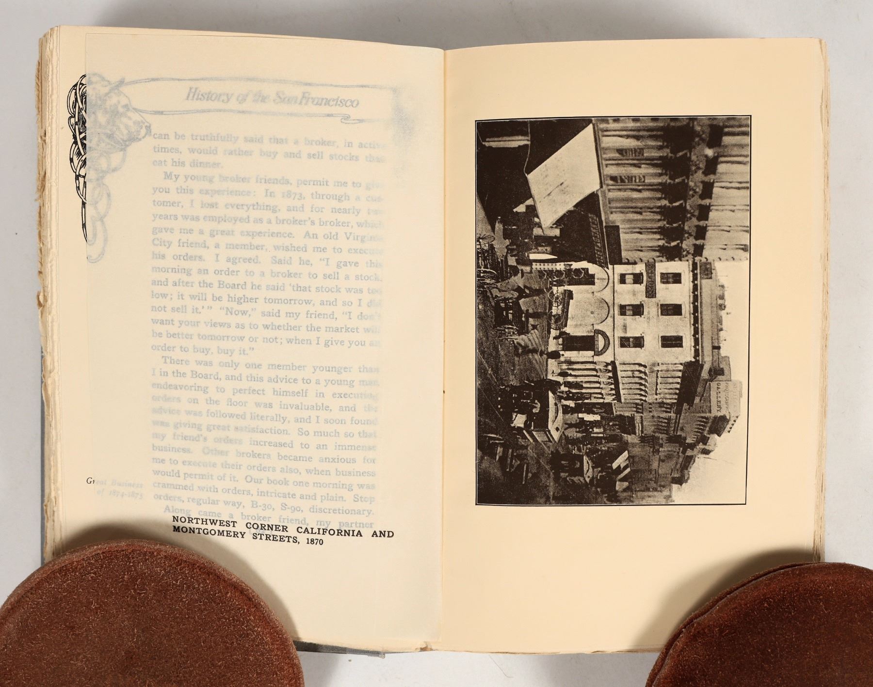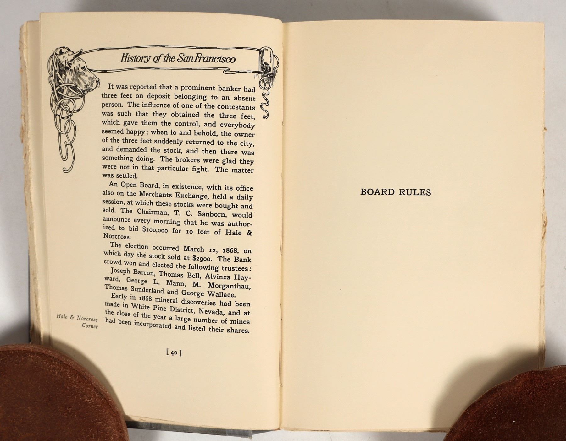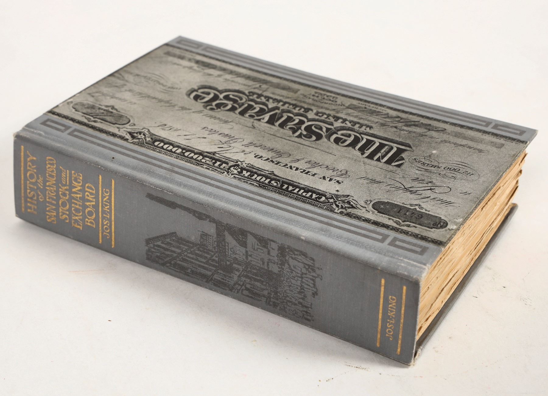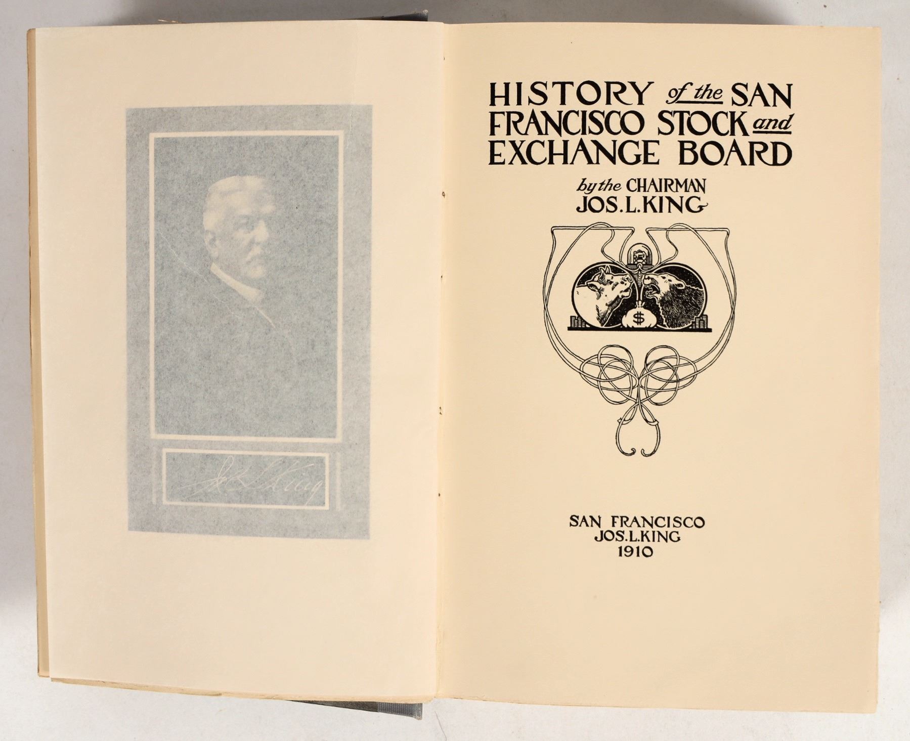 A copy of "History of the San Francisco Stock and Exchange Board" by chairman of the board Joseph L. King, published 1910. An excellently detailed account of this historical institution's early years. Hardback, 373 pages, original blue-gray fabric binding w/ gilt text and stock certificate applique on cover. Great margin illustration on all pages, dozens of photos throughout. Deckled edges, all opened, some with tears from clumsy opening. Otherwise excellent condition; see photos.