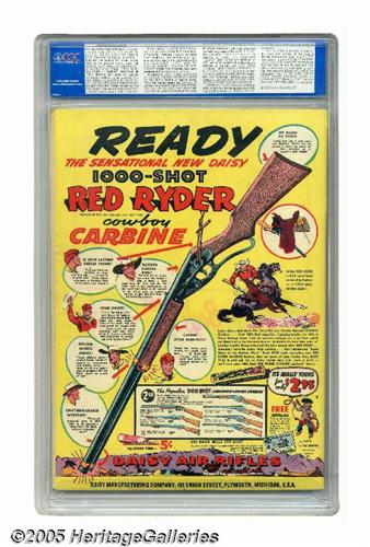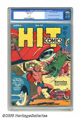 <B>Hit Comics #10 (Quality, 1941) CGC FN+ 6.5 White pages.</B></I> The first comic book work of Reed Crandall is in this very issue, starting a long comic book career that would continue first at Quality with the Blackhawks, then later at EC and elsewhere. The cover is another spectacular Lou Fine effort, featuring Hercules in a possible nod to <B>Action Comics</B></I> #1. Overstreet 2005 FN 6.0 value = $576; VF 8.0 value = $1,200. CGC census 6/05: 1 in 6.5, none higher.