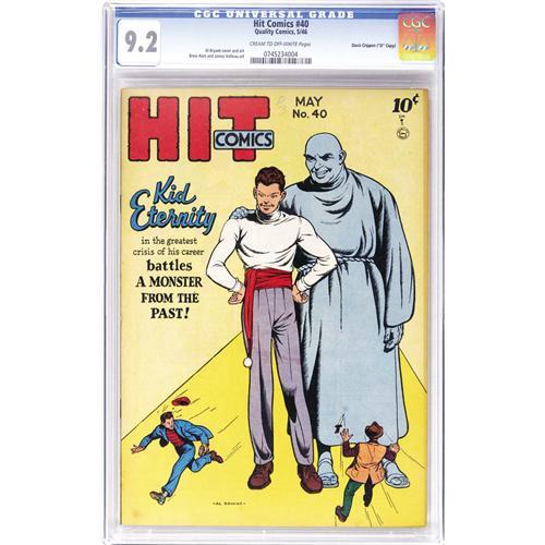 <B>Hit Comics #40 Davis Crippen ("D" Copy) pedigree (Quality, 1946) CGC NM- 9.2 Cream to off-white pages.</B></I> Here's the only copy graded above 7.0 by CGC as of this writing. The issue's only superhero, Kid Eternity, is drawn by Al Bryant on the cover. Overstreet 2006 NM- 9.2 value = $340. CGC census 6/06: 1 in 9.2, none higher. <I>From the Crippen Collection.</B></I> <BR><BR><B>Important notice:</B> Heritage usually auctions material at the rate of 200-250 lots per hour. On some occasions eBay Live bid software or the Internet may not be able to keep up with the pace of the auction. We recommend placing a realistic absentee bid now as insurance to avoid disappointment. Occasionally the auctioneer may eliminate or reject an eBay Live bid, and the auctioneer may also reopen a lot after the close of the eBay live bidding (usually because we missed an audience bid), and may reject your bid even if it shows you as the winning bidder. By bidding via eBay Live, you agree that Heritage may award the lot to another bidder at its sole discretion under the circumstances described above or any other reasonable circumstances. Since eBay bids are not shown to us until we open the lot on the floor, we treat those bids just like floor bids. In most cases the floor responds before the eBay bid is presented to us, due to Internet lag time, so for consistency we have made it a policy that floor bids are always considered first over tie eBay live bids. Also please note that all Heritage lots purchased through eBay Live carry a 22.5% Buyer's Premium. Please make sure you read the Terms and Conditions before you bid. This lot is being auctioned in conjunction with a live floor auction by Heritage Auction Galleries. All final auction and invoice information will be supplied by Heritage Auction Galleries, and all other information should be considered preliminary. Lot:41001 <BR><BR><B>Winning Notification and Billing:</B> After the FINAL session in this auction is complete, Heritage will send e-mail and snail mail invoices. This process normally takes several days. All final auction and invoice information will be supplied by Heritage Auction Galleries, and all other information should be considered preliminary. <BR><BR>This auction will be conducted on a live auction floor and over the Internet through eBay Live. If you choose to place an absentee bid, please take a moment to <font color='#0000ff'><u><a href='http://pages.ebay.com/liveauctions/help/before/laabsentee.html'>learn how eBay Live absentee bidding works</a></u></font><font color='#000000'>