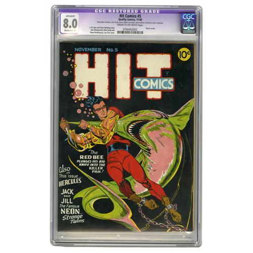 <B>Hit Comics #5 (Quality, 1940) CGC Apparent VF 8.0 Moderate (P) Cream to off-white pages.</B></I> A classic cover by the great Lou Fine graces this issue, and our copy looks very sharp thanks to some very skillful professional restoration. This may be the best cover of the title's run, especially since by this time our hero, the Bee, had abandoned his original costume (which had horizontally striped pants!). Also in the issue is a Hercules story drawn by Dan Zolnerowich, as well as the artistic stylings of Nick Cardy. CGC notes, "Restoration includes: color touch, pieces added, tear seals, cover cleaned, reinforced, cover re-glossed." Overstreet 2006 GD 2.0 value = $545; VG 4.0 value = $1,090; FN 6.0 value = $1,635; VF 8.0 value = $3,815.