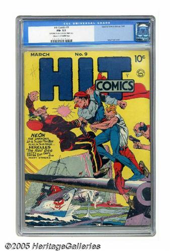 <B>Hit Comics #9 (Quality, 1941) CGC FN- 5.5 Cream to off-white pages.</B></I> We've got more Lou Fine covers in this auction than you can shake a pencil at, and here's another Fine effort. Once again Neon is the cover star; other characters include Betty Bates, Lady at Law (she's an attorney if you haven't guessed) and prizefighter Don Glory. CGC notes, "Centerfold detached at bottom staple only." Overstreet 2005 FN 6.0 value = $576. CGC census 6/05: 1 in 5.5, 1 higher.