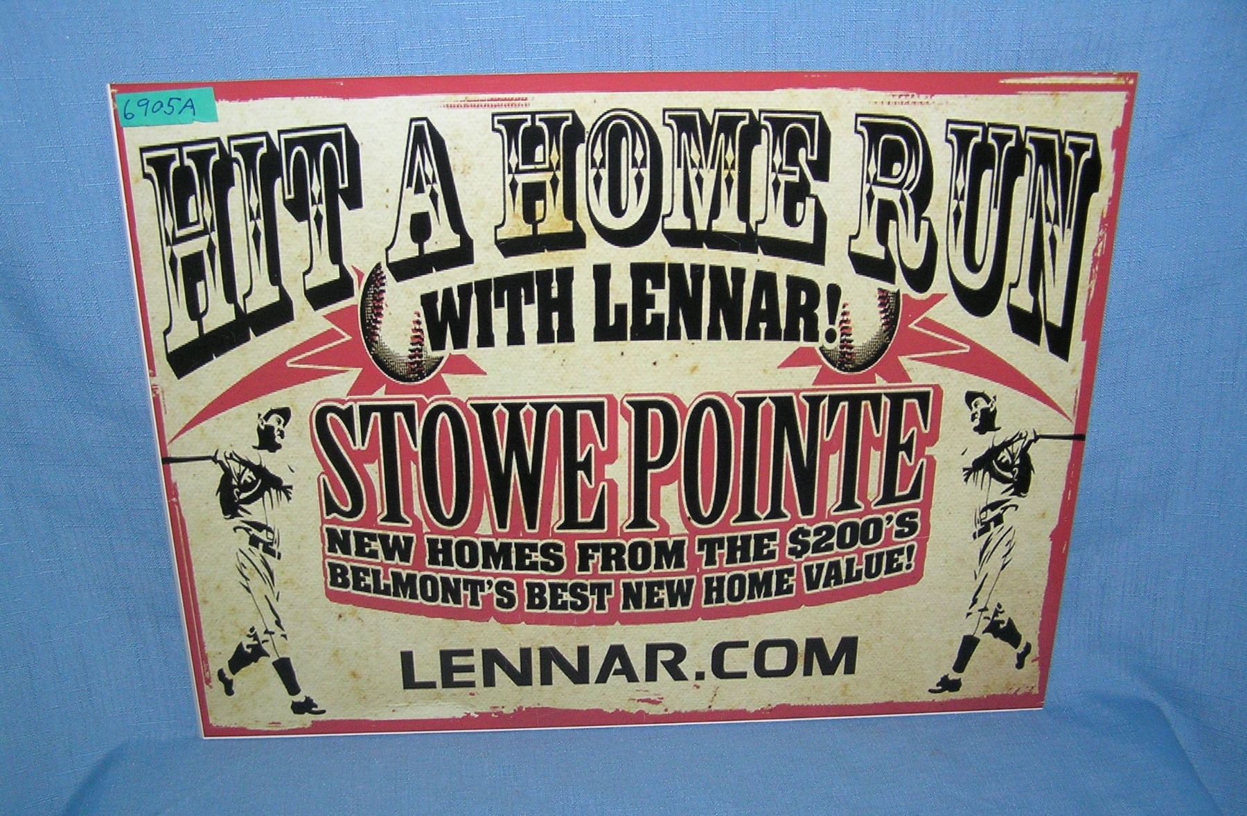 Hit a homerun with Lennar! retro style advertising sign printed on PVC hardboard these signs are auctioned for their decorative and display purposes 12 inches by 16 inches est. value $50.00-$60.00