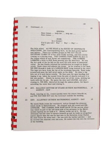 Hitchcock's Frenzy Production Script With Cast Signatures - A rare and wonderful collectable for Alfred Hitchcock fans. "Frenzy" (1972) was Alfred Hitchcock's penultimate film. His fifty-second feature film as a director. However for many it was his greatest triumph, and considered by many to be truly his last film. He made one more film, "Family Plot" in 1976, but this was considered more of an amuse-bouche than a true Hitchcock thriller. But "Frenzy" was his ultimate thriller. After a string of masterpieces in the second half of his career including "Rear Window", "Vertigo", "North By Northwest", "Psycho", and "The Birds", Hitchcock hit a snag. He couldn't seem to find his footing in the modern age of filmmaking, and his next two films "Torn Curtain" and "Topaz" were not critical or financial successes. It was at this point that he brilliantly decided to go back to his roots. He returned to his love of "the sweet smell of silent murder", and the theme of "the wrong man" by choosing "Frenzy", based on a novel inspired by a real London Serial Rapist and Murderer. And he went back to his home of London to film the entire production (not having filmed a movie in England since the 1950's), utilizing accomplished English actors, known more for their talent than their star power. He even hired some of the actors he had used over 50 years before when he was starting out as a director in England as a good luck charm. And it worked. What came out was one of his most critically acclaimed and financially successful film in years. It also was one of his most graphically violent, and with his first nude scenes as well, also gave him his most severe rating to date. This is an actual production script from the production of "Frenzy" complete with the signatures of all the main actors from this classic film on the title page. Having any autographs from these actors, let alone, all together in the script that made them immortal, is rare indeed. This is most likely a one-of-a-kind treasure. They signatures include Jon Finch (Richard Blaney), Anna Massey (Babs Milligan), Joan Marsh (Monica Barling), Clive Swift (Johnny Porter), and Bernard Cribbins (Felix Forsythe). The script comes from the personal collection of one of the major Hitchcock memorabilia collectors in England who personally obtained the script, and then went through the painstaking process of getting every signature of the main cast on the script by approaching the actors himself, either backstage, at studios, or in their homes. The script comes with a Letter of Provenience from this passionate collector.