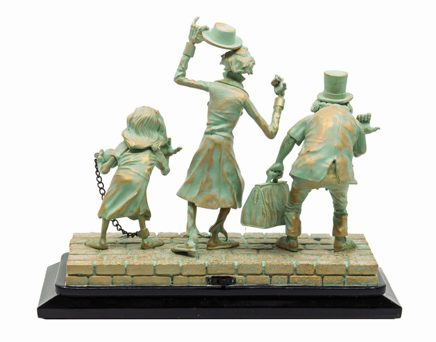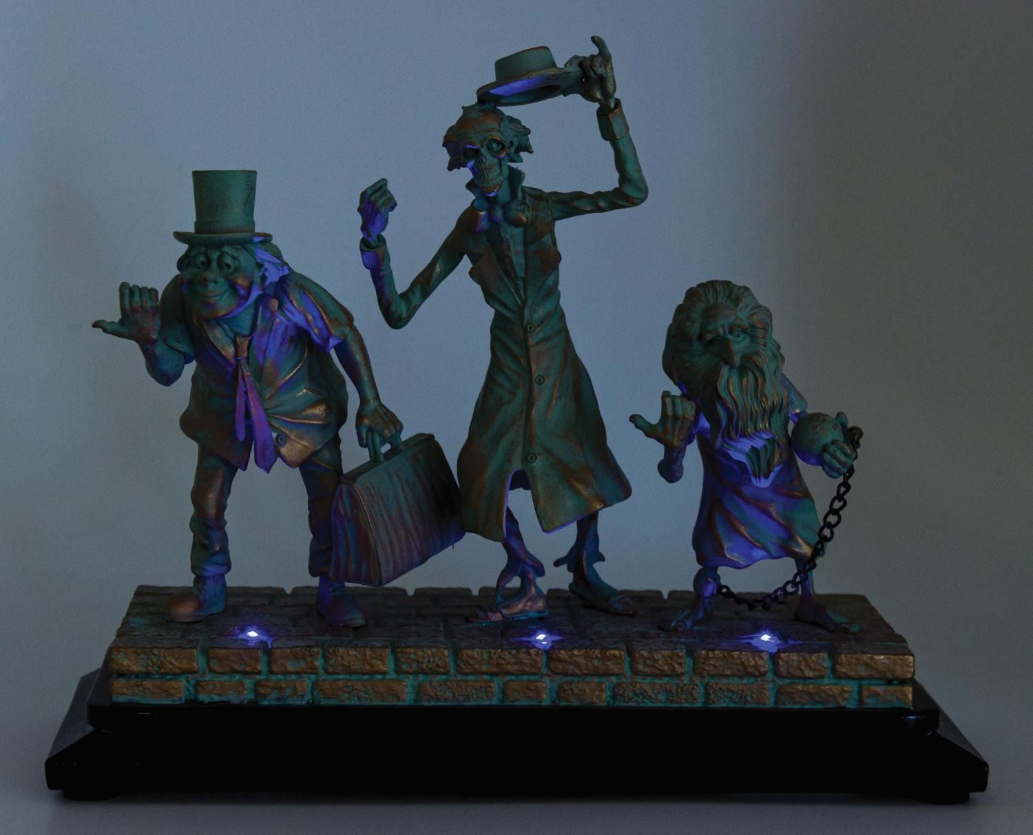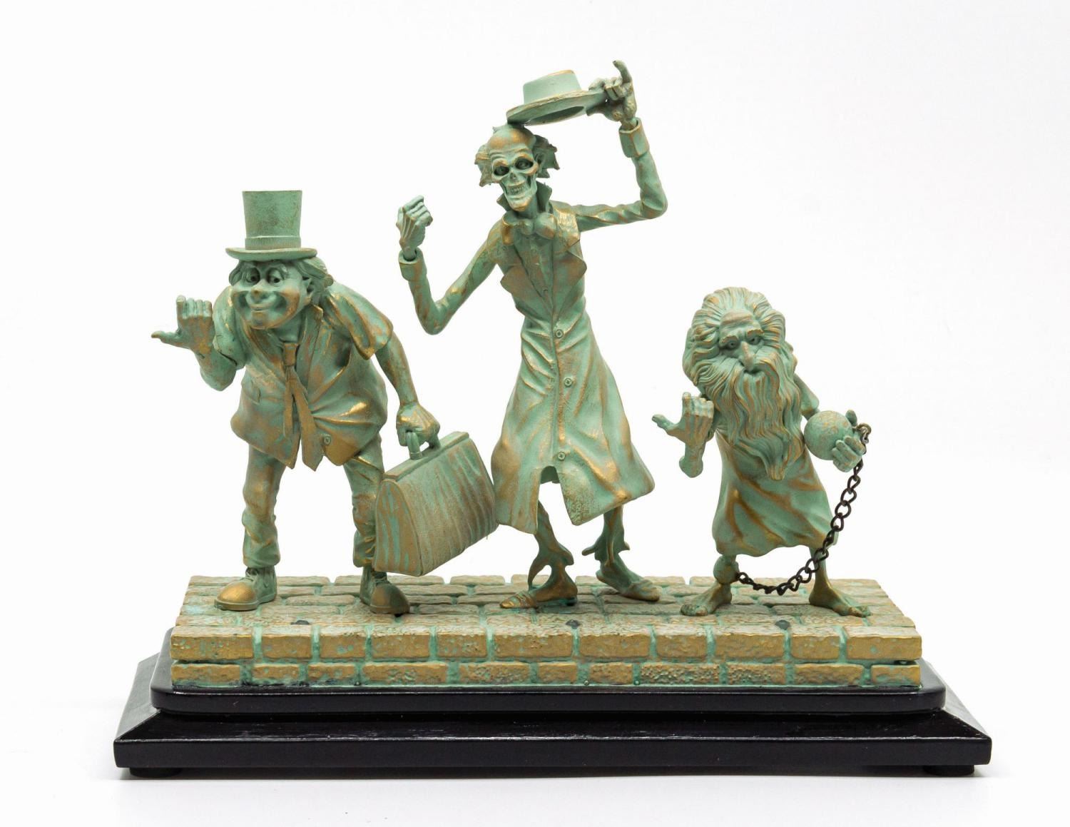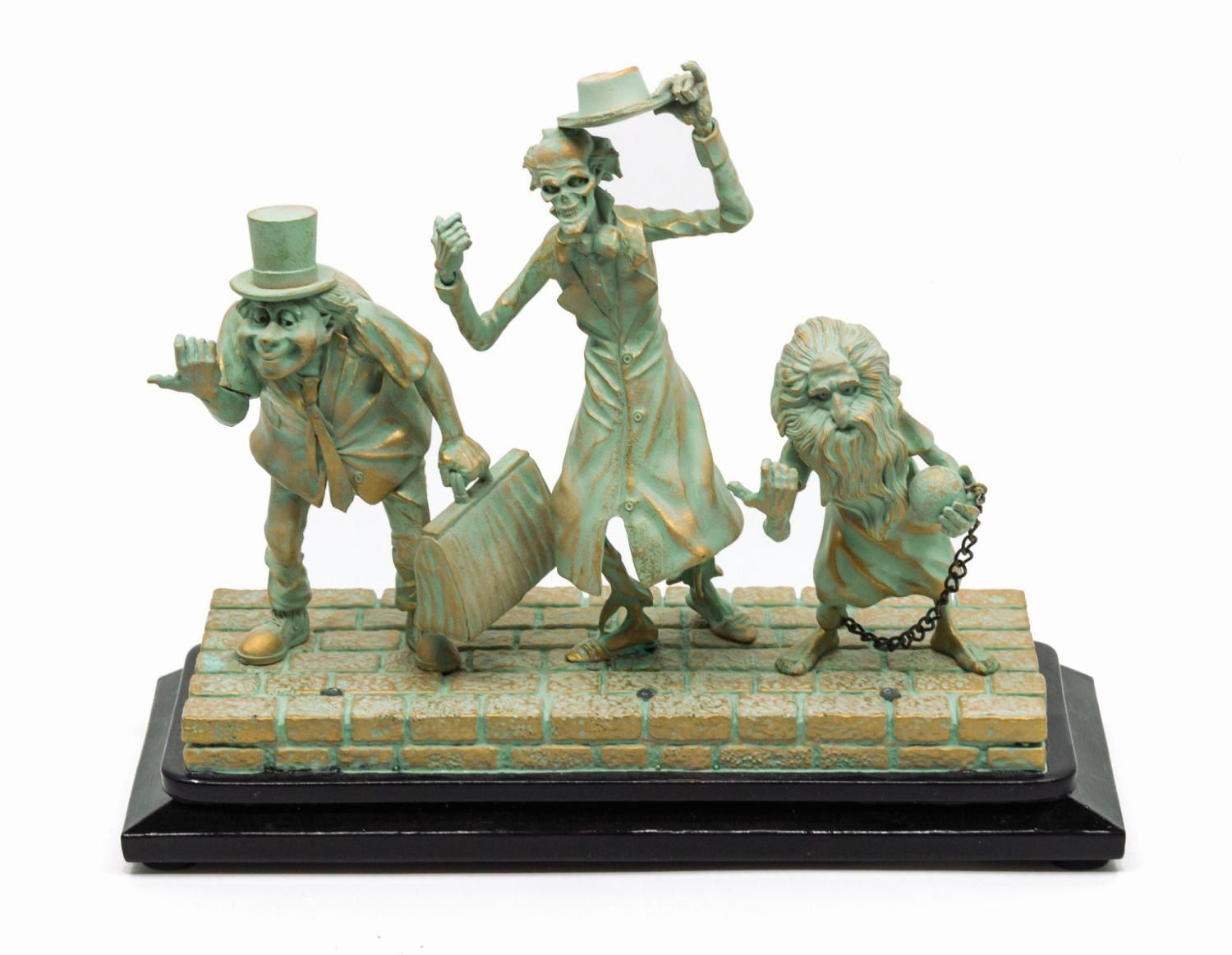 (Disneyland, 2019) A sculpture of the Hitchhiking Ghosts designed by Costa Alavezos and Tony Cipriano to celebrate the 50th anniversary of Disneyland's Haunted Mansion. Created in a limited edition of only 50, this special figure has a bronze finish with faux antique patina lending Ezra, Phineas, and Gus the same ghostly green glow they manifest in the attraction. A slider switch on the base activates blue LED lights which illuminate the figures. The bottom of the base is marked with edition and Haunted Mansion anniversary statements. The original box is included. Measuring 8"x10" and 3.75" deep, the sculpture is in very fine condition.