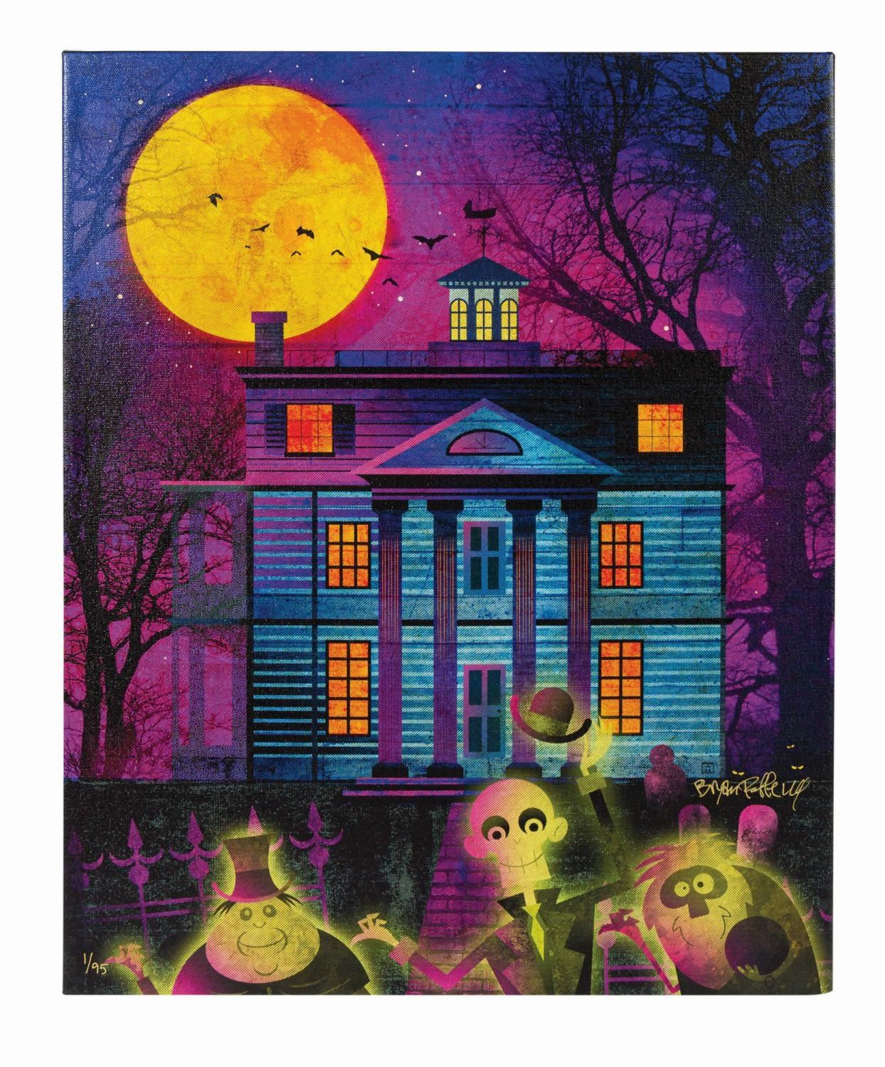 (Disneyland, 2014) A limited edition print on stretched canvass titled "The Hitchhikers" by artist Bryan Fyfe. The mixed media composition depicts a nighttime scene of Ezra, Phineas, and Gus in front of the Haunted Mansion, and is signed by the artist in gold ink a lower right, "Bryan Fyffe," and hand numbered in gold ink at bottom left, "1/95". The piece is accompanied by a Disney COA. Measuring 20"x16", the print is in fine condition with minimal wear.