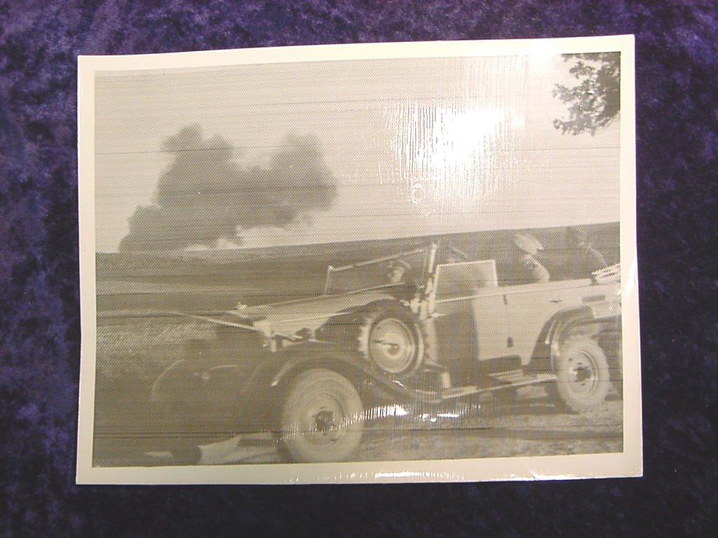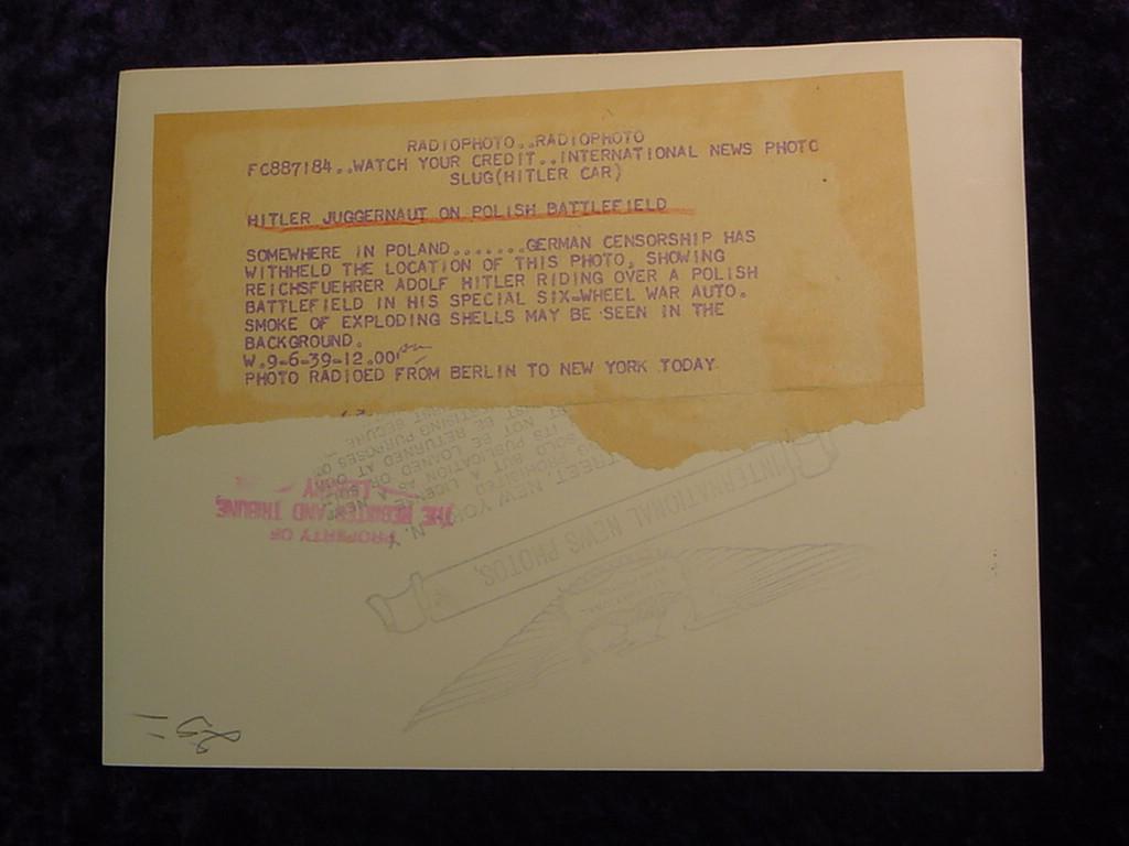 ôHitler Juggernaut on Polish Battlefieldö Radiophoto from Berlin to New York. Somewhere in Poland.... German Censorship has witheld the location of this photo" showing Reichsfuehrer Adolf Hitler riding over a Polish Battlefield in his special six-wheel war auto. Smoke of exploding shells may be seen in background. 6 1/2ö x 8 1/2ö.