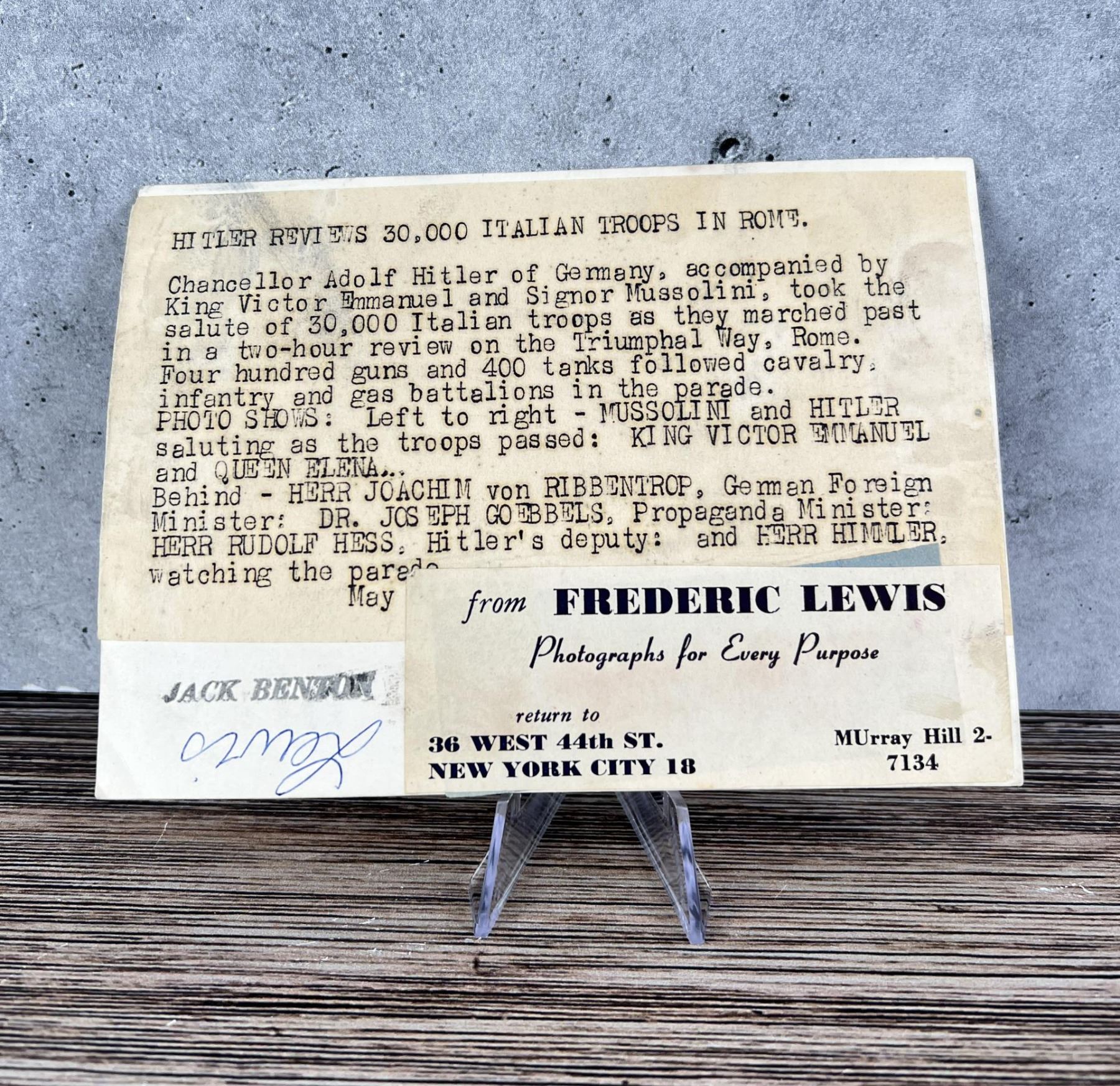 Frederic Lewis Photo Agency. 6" by 4 1/4".