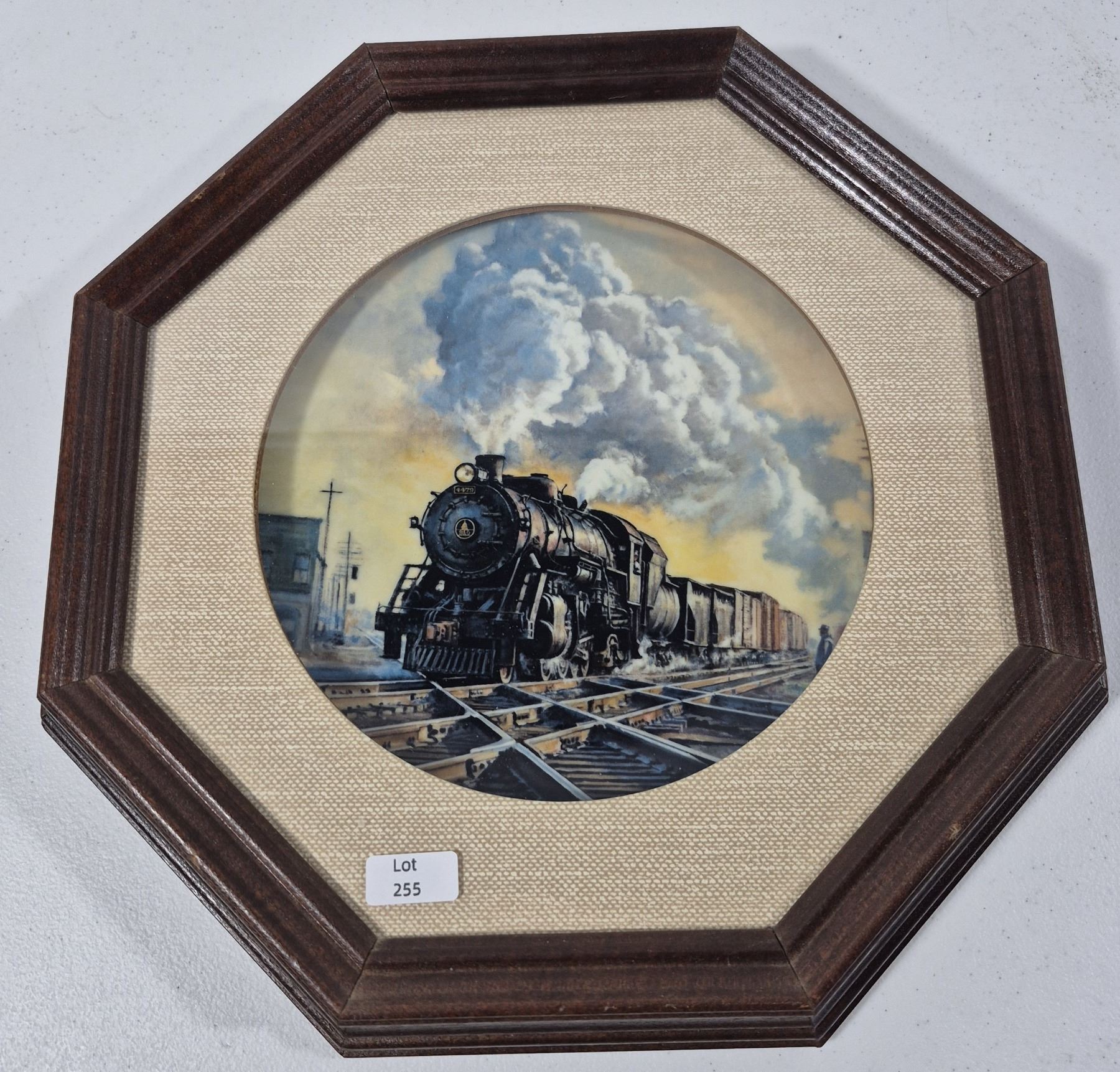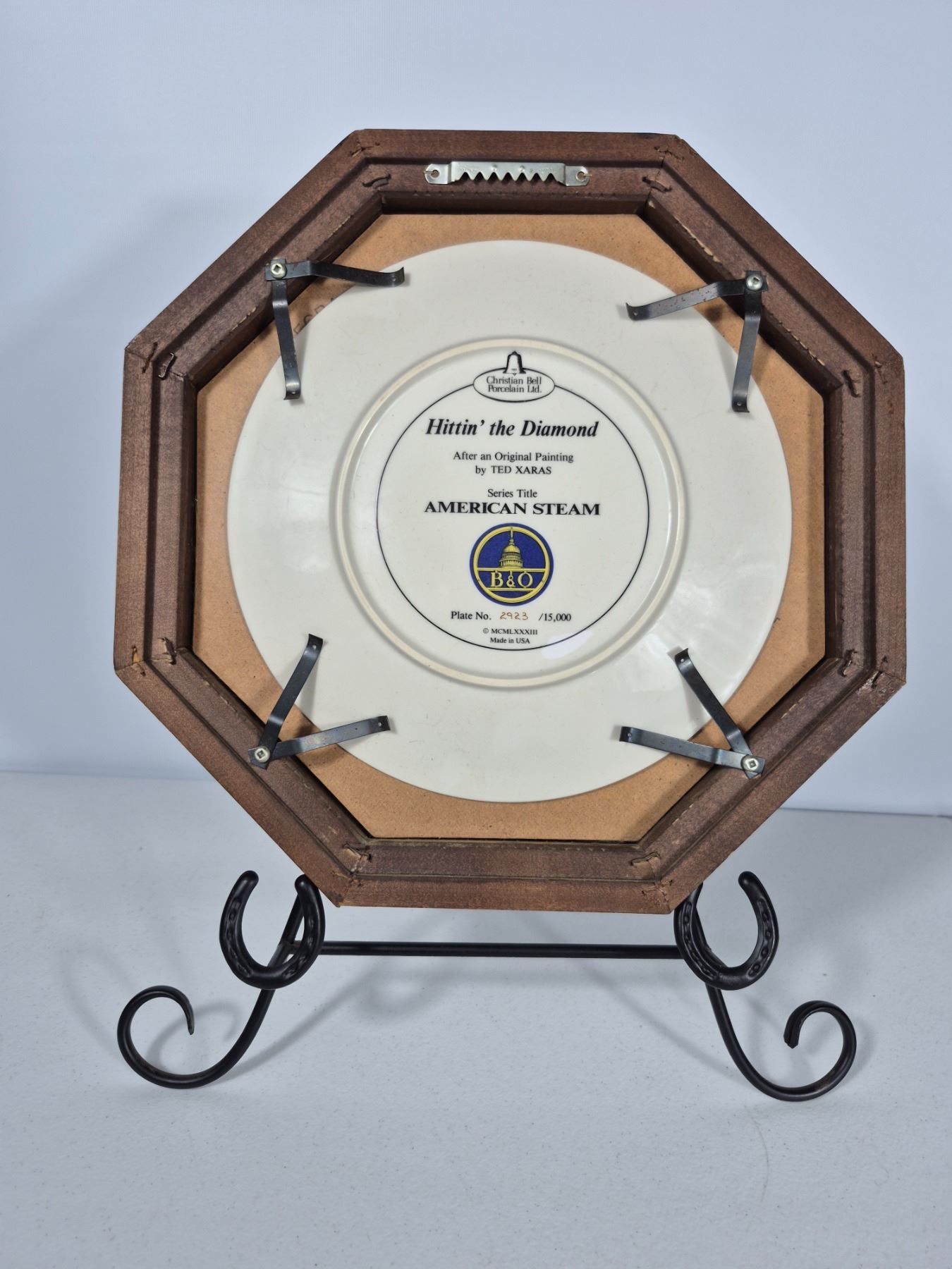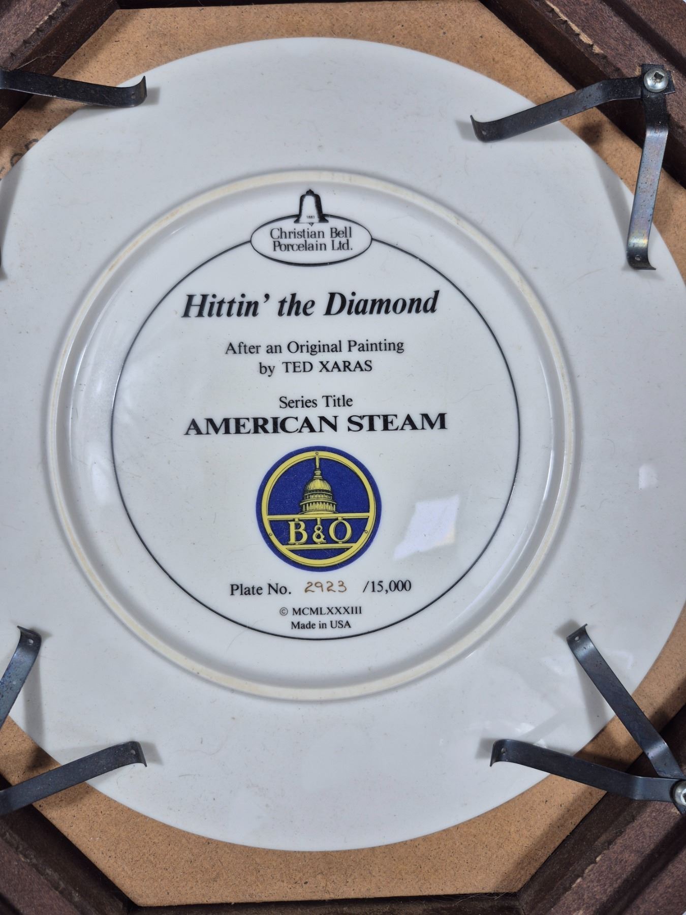 Limited edition porcelain collector plate titled 'Hittin’ the Diamond', part of the American Steam series by Theodore A. Xaras. Produced by Christian Bell Porcelain Ltd. for B&O Railroad. Features dramatic rail yard artwork of a steam locomotive crossing the diamond tracks. Plate No. 2923/15,000. Presented in an octagonal wooden frame with backing.