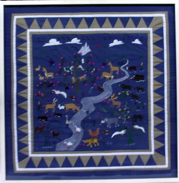 Fine needlework has always been a source of great pride to Hmong women.   Cross stitch, needle weaving and other techniques were used to create these wearable works of art.  Traditionally Hmong needle work was done in bright colors but during the time they lived in refugee camps needlework sold to tourists was a major source of much needed income. In order to make their work more appealing to Westerners they began to use softer tones for the items they made to sell.  Perhaps the best known form of Hmong needle art is "Paj Ntaub Tib Neeg" also called "story cloth" These lovely pictorial embroideries developed very recently in Hmong history. It appears that Hmong men began to draw elements of traditional Hmong stories to help make sure they would be remembered during the times of change. While in the refugee camps, if not sooner, women began to have the men draw on fabric so that they could stitch the stories on cloth.