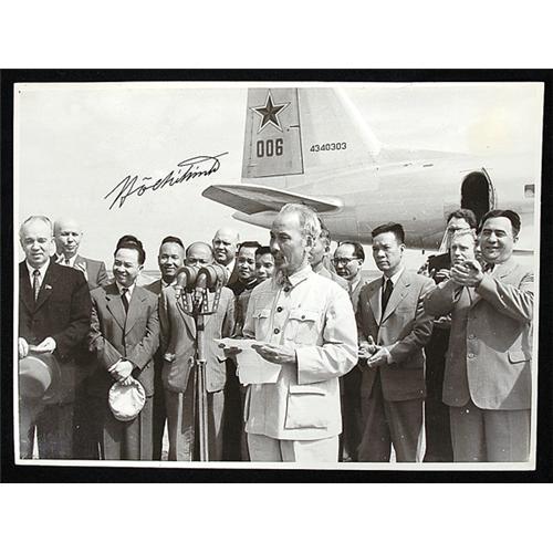 <Our item number 141051><B>Ho Chi Minh.</B> (1890-1969) First president of North Vietnam (1954-69) Victorious in the French Indochina War (1946-54), the communist leader led North Vietnam's struggle to defeat the U.S.-supported government in South Vietnam. Black-and-white photograph signed, 6¾ x 9¼ in., n.p., n.d. A three-quarter portrait of the North Vietnamese president delivering an address. Small crease at upper corner, else fine. <BR>Estimated Value $500 - 600. <BR><BR>Our item number 141051<BR><IMAGES><P ALIGN="CENTER"><IMG SRC="http://www.goldbergcoins.net/liveauction/49jpegs/141051.jpg"> </P></IMAGES>