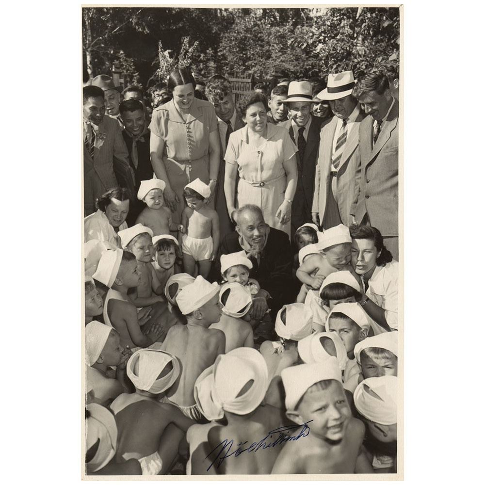 Vintage glossy 6.25 x 9.25 photo of Ho Chi Minh crouched down among numerous children during his visit to Germany in July 1957, signed in black ink. In fine condition. Our first signed portrait of Ho Chi Minh in 12 years.