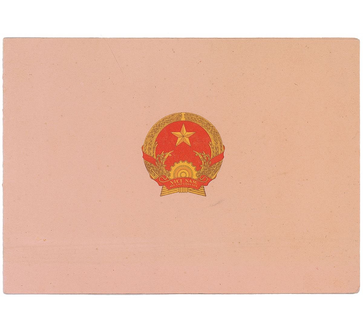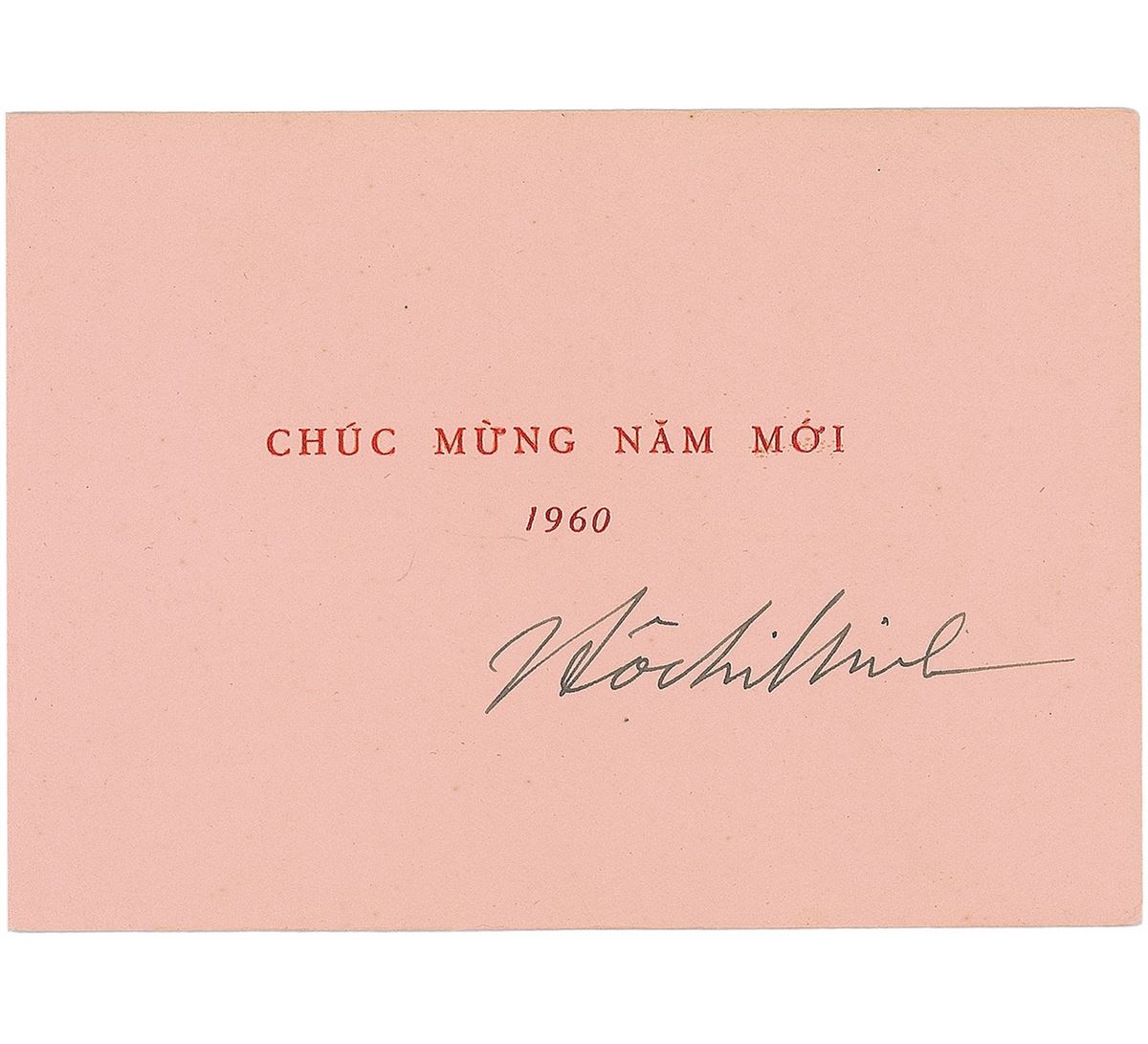 Rare greeting card featuring the emblem of Vietnam on the front, measuring 5.5 x 4 closed, with a red printed Vietnamese greeting inside (translated), “Happy New Year, 1960,” signed below in fountain pen by Ho Chi Minh. In fine condition. Accompanied by a letter of provenance from a previous owner stating that the card was sent to her uncle, who served as Canadian commissioner on the International Supervisory Commission for Vietnam in 1958 and was posted to New York as consul in 1960.