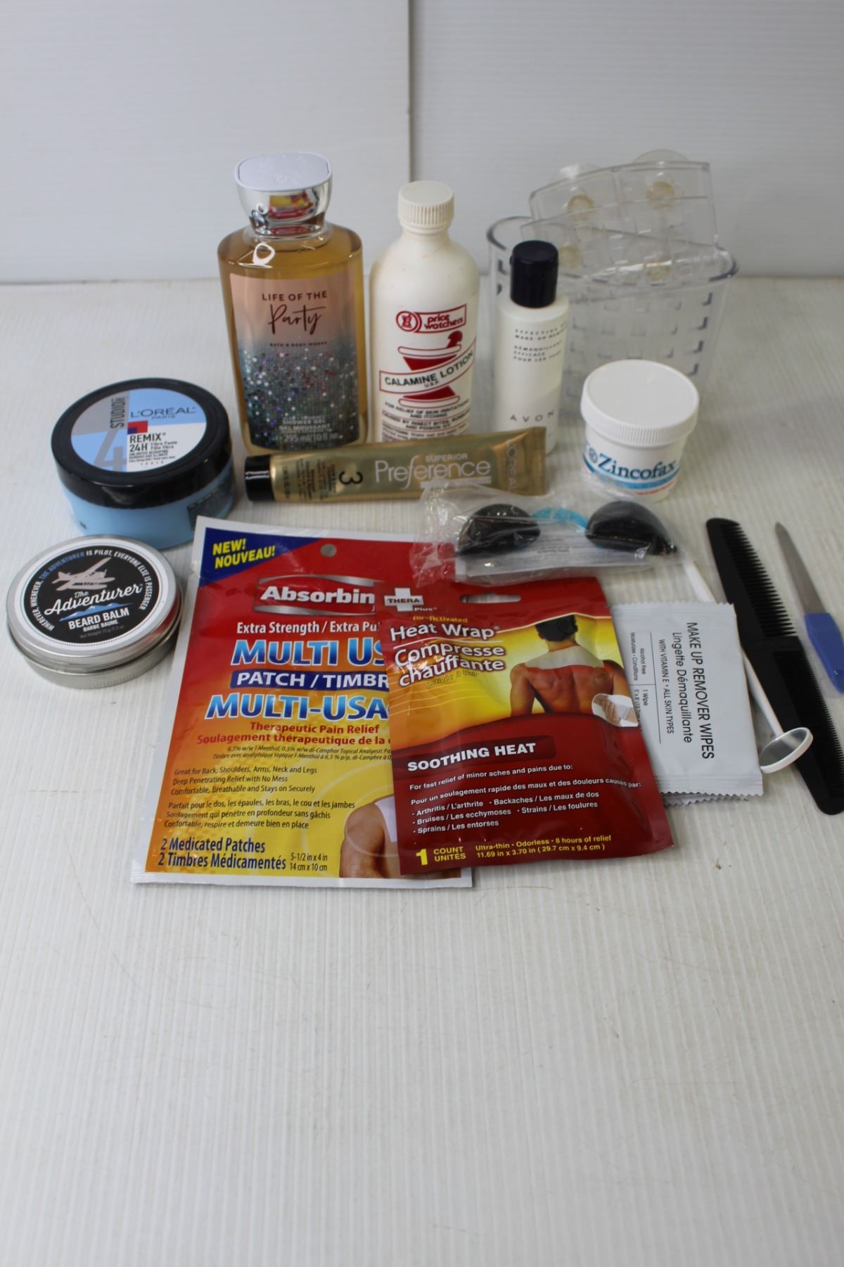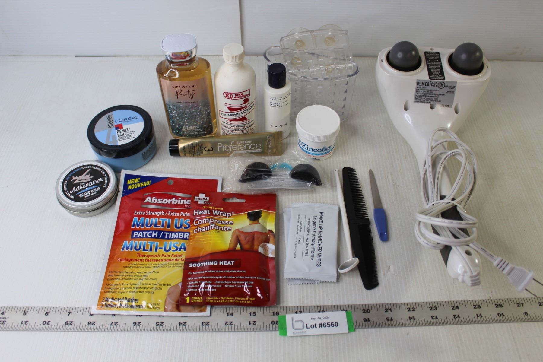 HoMedics Percussion Massager With Heat (Works), Assorted Personal Amenities (Calamine Lotion, Shower Gel, Zinc Cream, Beard Balm, Loreal Fibre Paste), Misc.