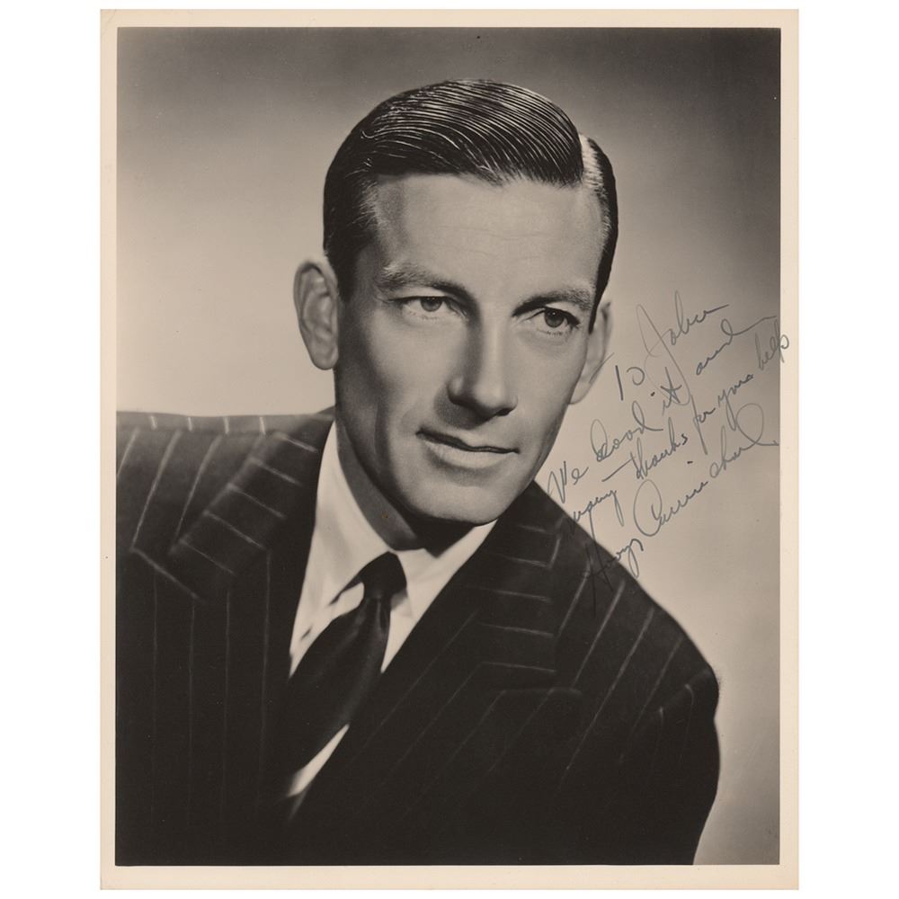 Vintage matte-finish 8 x 10 photo of Carmichael in a handsome bust-length pose, signed and inscribed in fountain pen, "To John, We dood it and many thanks for your help, Hoagy Carmichael.†In very fine condition.