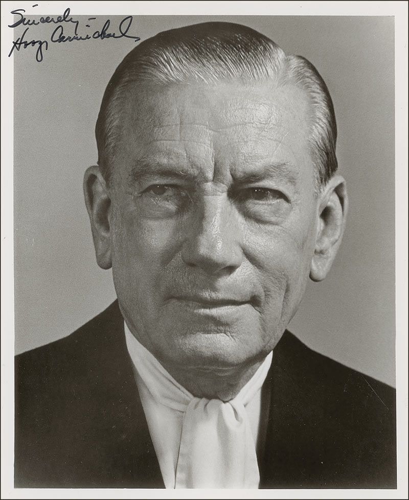 Glossy 8 x 10 head-and-shoulders photo, signed in black felt tip, “Sincerely, Hoagy Carmichael.” In fine condition, with scattered light surface marks and a few dings.