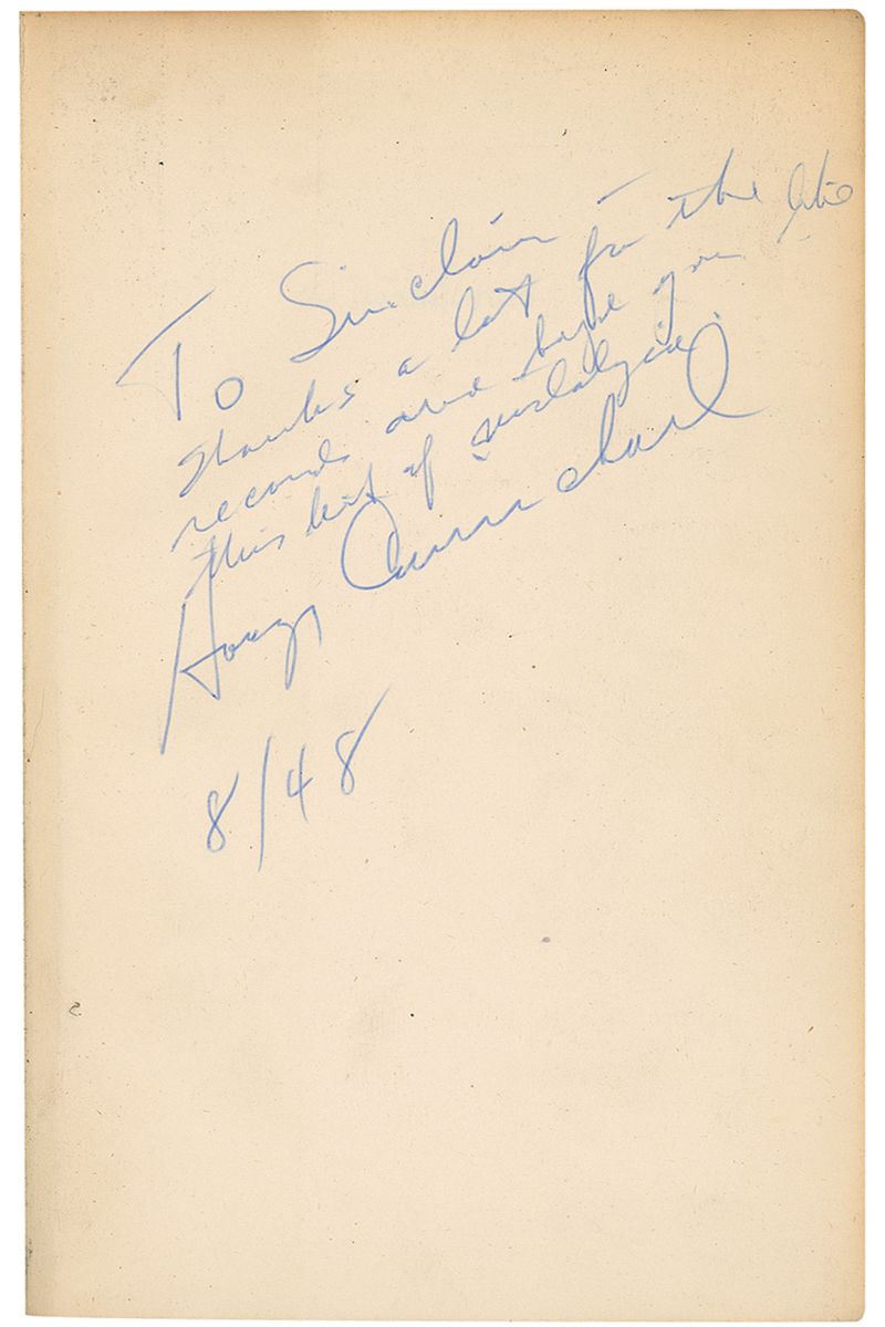 Signed book: The Stardust Road. First edition. London: Musicians Press Limited, 1947. Softcover, 5.25 x 8.25, 156 pages. Signed and inscribed on the first free end page by Carmichael and dated August 1948. Detached front flap, toning to edges of signed pages, mild toning to remaining pages, toning and light peeling to covers, and a notation on last free end page, otherwise very good condition.