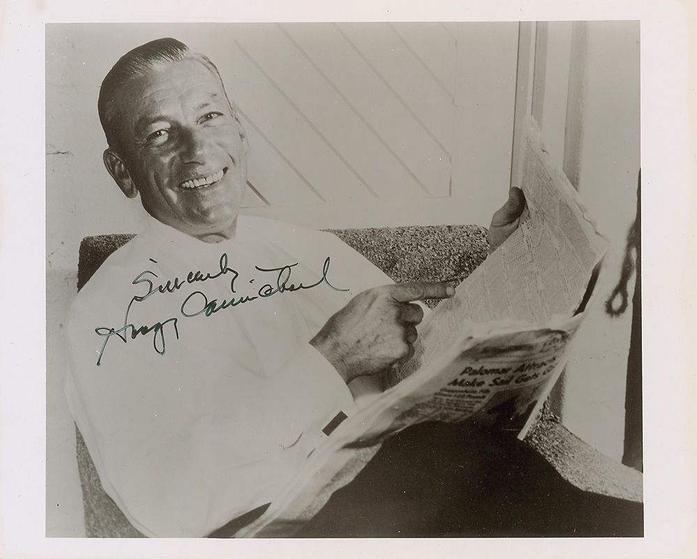 Semi-glossy 10 x 8 cardstock photo, signed in black felt tip, “Sincerely, Hoagy Carmichael.” In fine condition, with a few dings to the top edge.