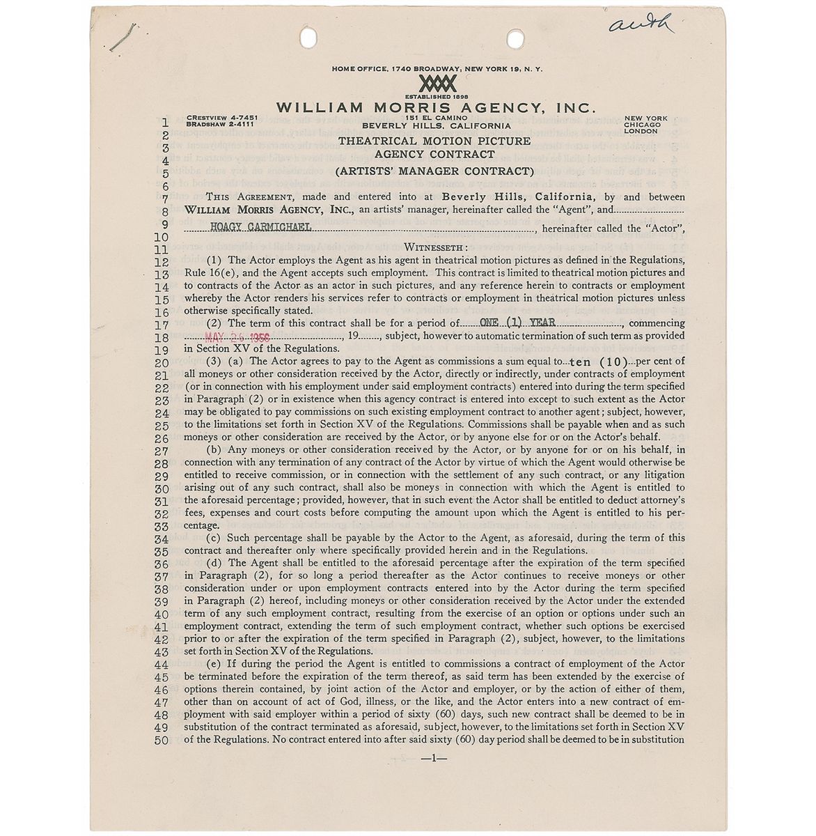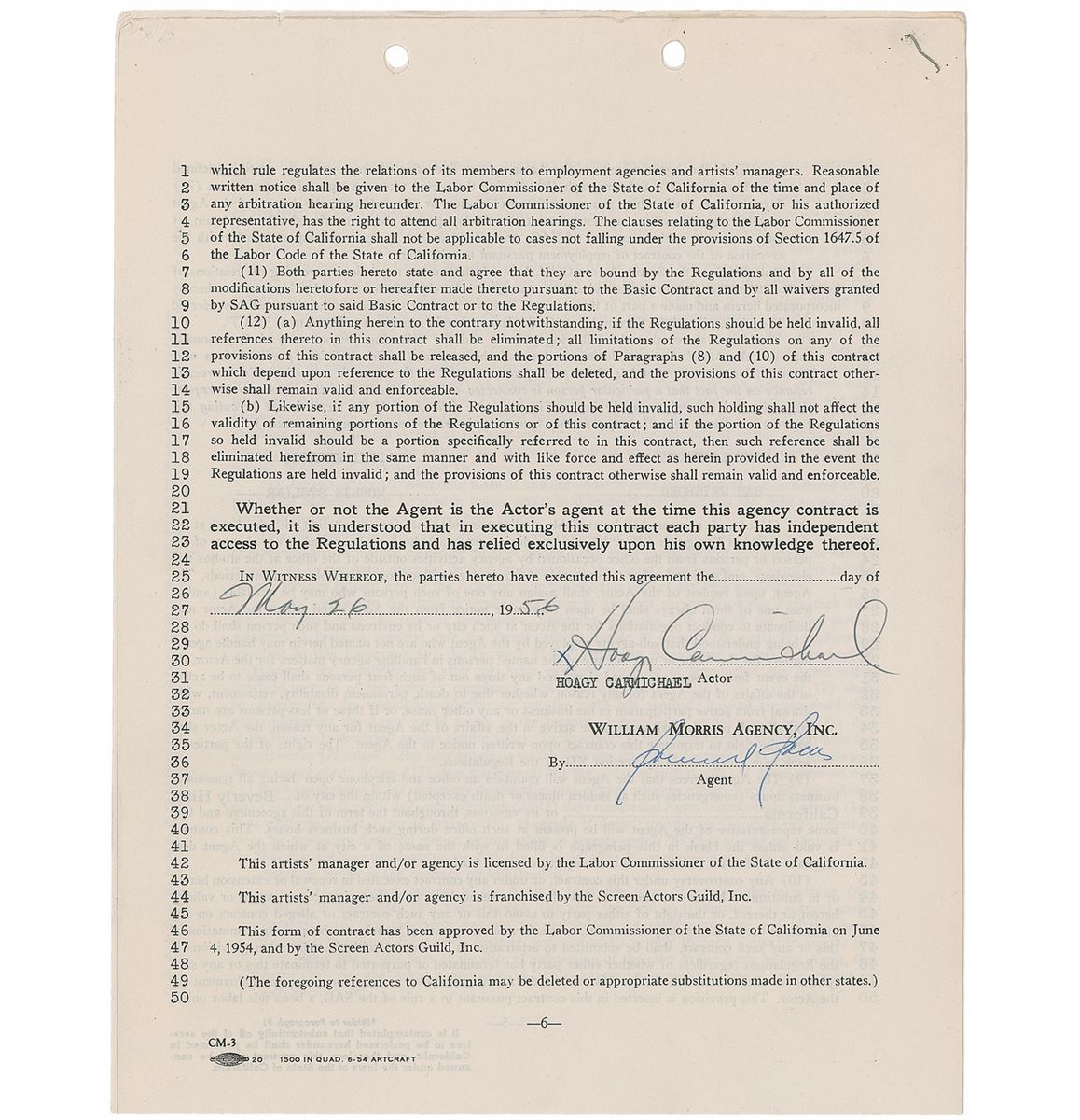 DS, three pages both sides, 8.5 x 11, May 26, 1956. Standard William Morris Agency theatrical contract in which Carmichael agrees to pay a commission of 10% of earnings to the agency for a period of one year. In fine condition, with expected document wear.
