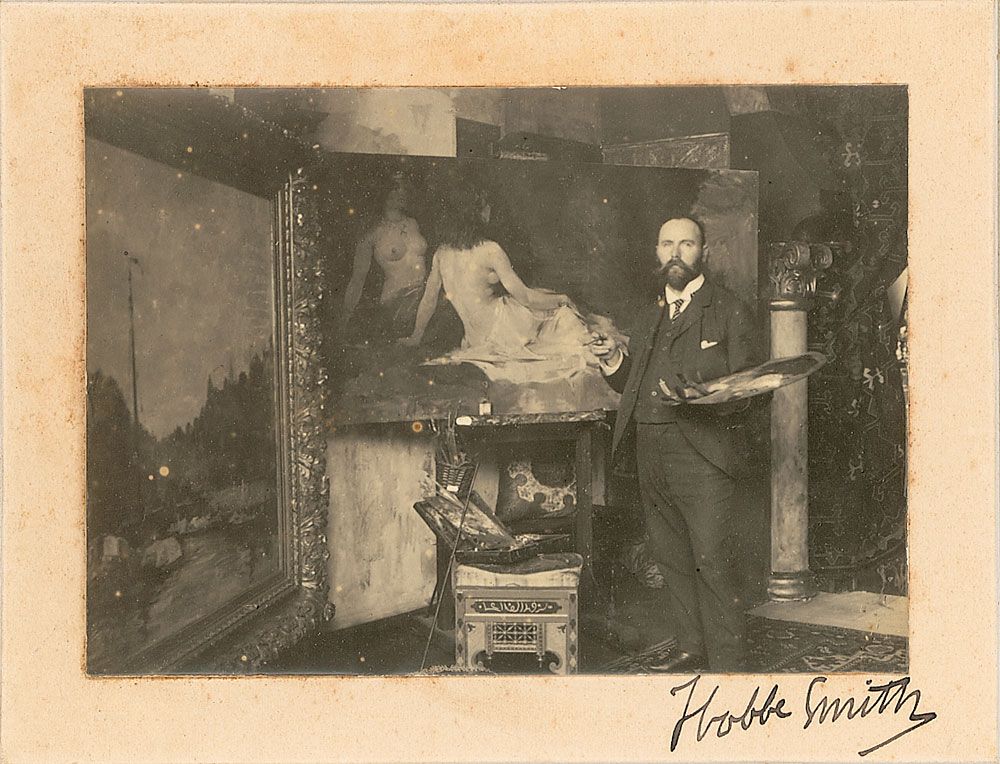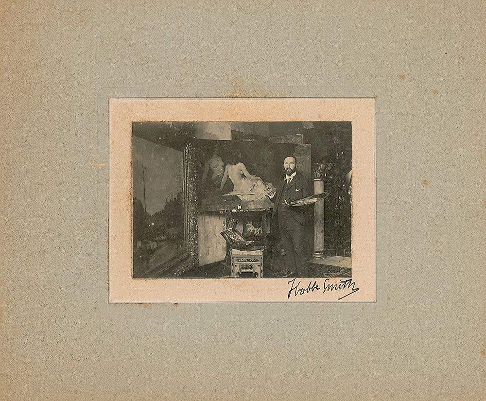 Dutch painter (1862–1942) influenced by impressionism, best known for his figures and sea views. Vintage matte-finish 4.25 x 3 photo of Smith at work in his studio, affixed to a 9.75 x 8 two-layer mount, signed on the mount in black ink. In very good condition, with corners of the photo and mount beginning to detach, and a bit of scattered foxing.