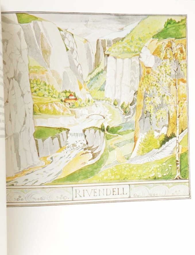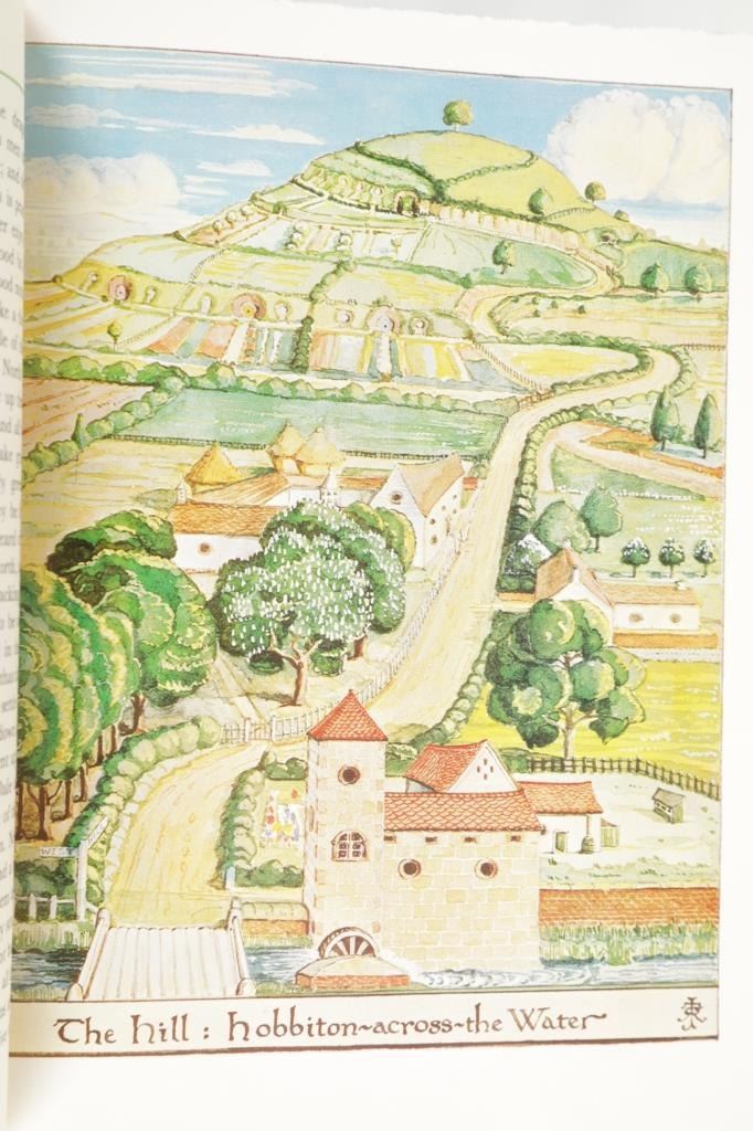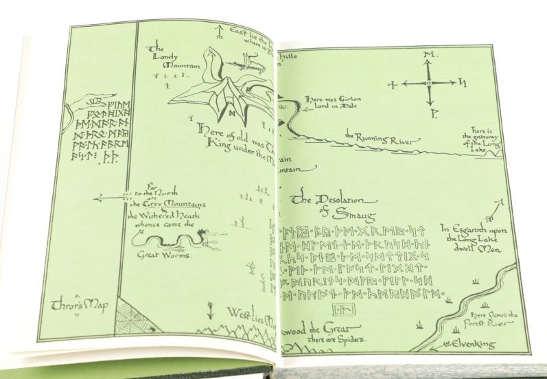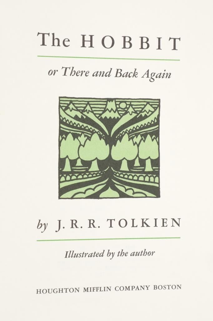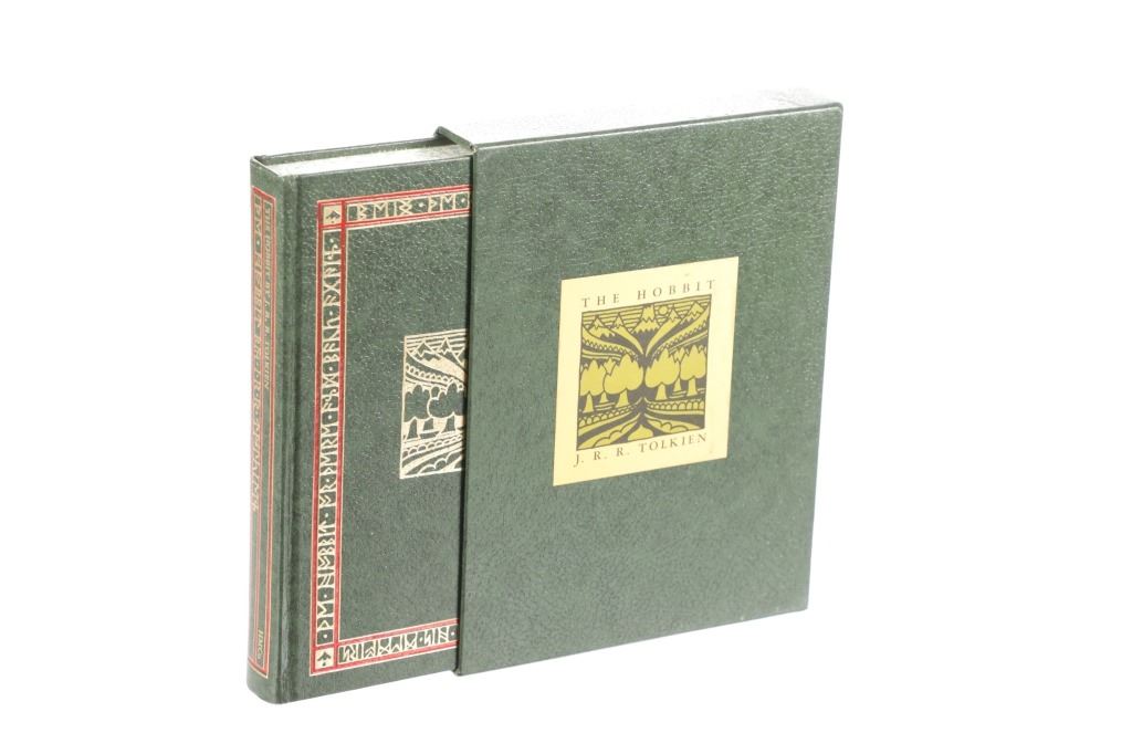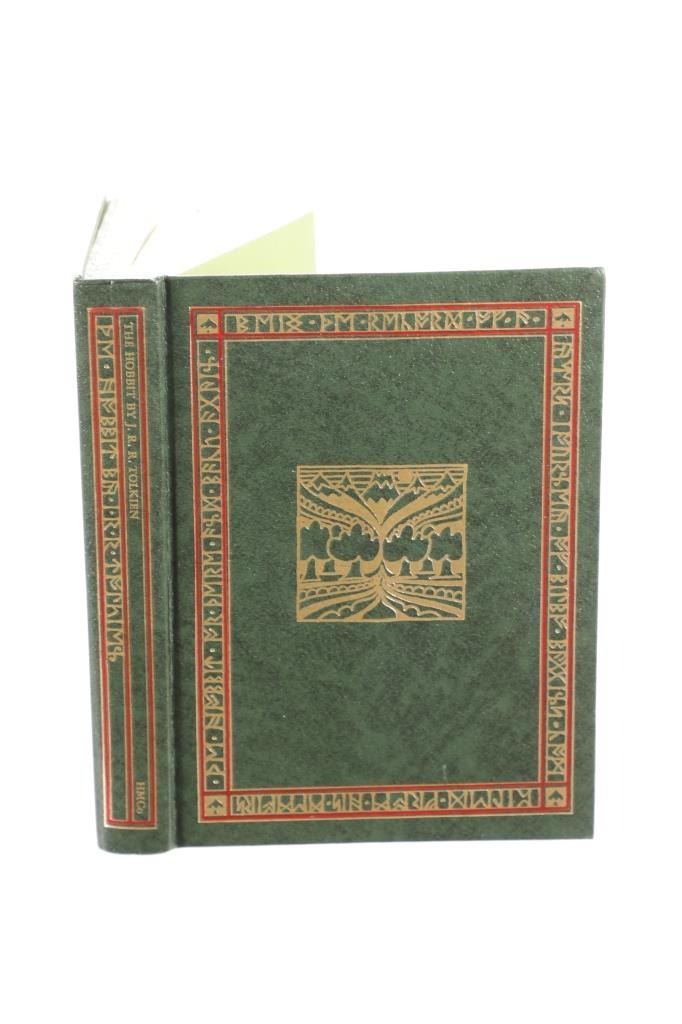 Featured in this lot is this "Hobbit Anniversary Edition in Slipcase", 1966, J. R. R. Tolkien, publisher Houghton Mifflin Company. John Ronald Reuel Tolkien CBE FRSL was an English writer and philologist. He was the author of the high fantasy works The Hobbit and The Lord of the Rings. From 1925 to 1945, Tolkien was the Rawlinson and Bosworth Professor of Anglo-Saxon and a Fellow of Pembroke College, both at the University of Oxford. This "The Hobbit, or There And Back Again" anniversary edition features the original illustrations and design. This large work has the iconic original dustjacket design, as well as numerous colour illustrations. A rare and highly sought-after edition. This green textured leatherette bound illustrated gold and red gilt hardcover is in very fine condition, near new condition with runes and red highlights on front cover. Intact pages have marbled top, bottom and fore edges. Green slip case is in very nice condition, illustrated title label on cover. Measures in slip case 7"W x 9.5"L x 1.5"D approximately. Weight approximate 2lb