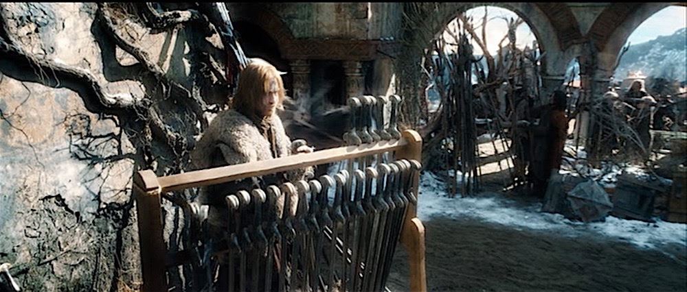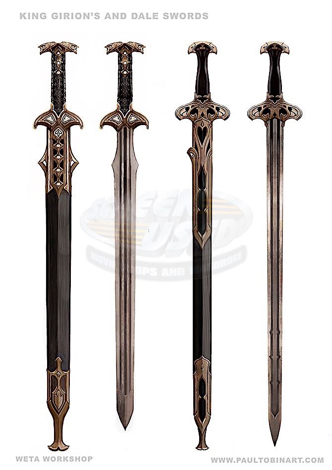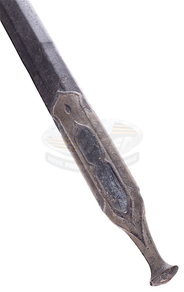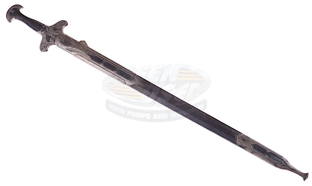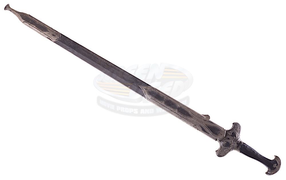 (New Line Cinema, 2014) This prop sword was custom-made by "Weta" for use by various actors and as set dressing during filming. The sword/scabbard is made of hard molded rubber and is intricately detailed and distressed for filming. Minor wear from use is present, measures 42" in length.