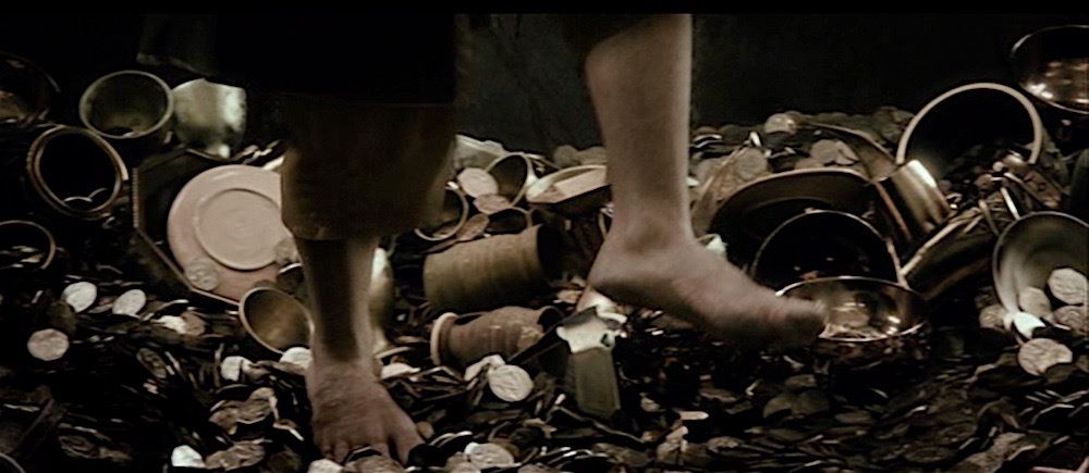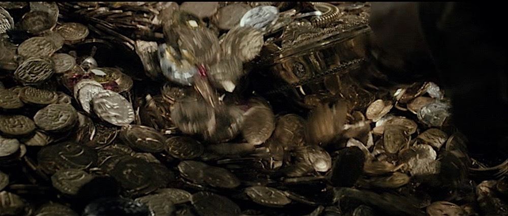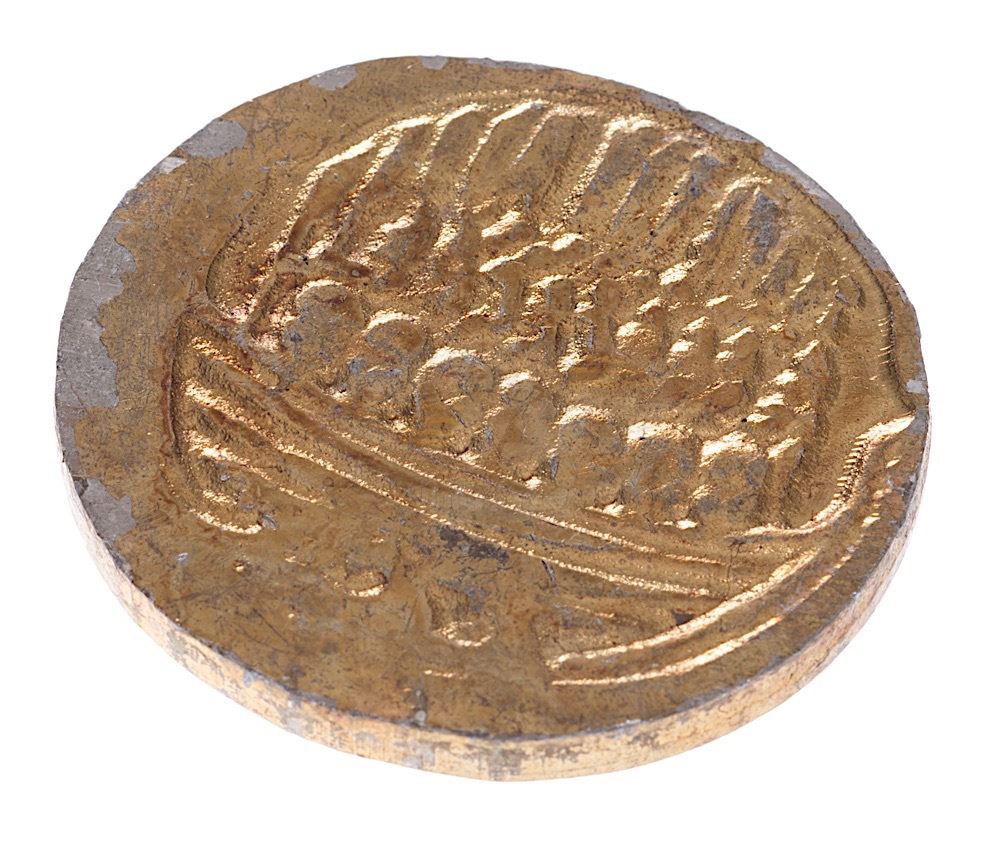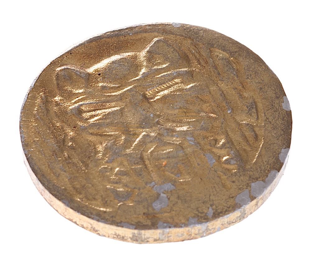 (New Line Cinema, 2013) This prop treasure coin was custom-made by the production for use by various actors and as set dressing. The coin is made of metal with a gold color finish. The coin features a stamped image on both sides and has minor wear from use. The images are Thror, King of Erebor and a ship with Dwarven Warriors. Measures 1.75" in diameter.