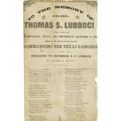 <B>Alfred M. Hobby; To The Memory of Colonel Thomas S. Lubbock</B></I> who died at Nashville, Tenn., on Thursday, January 9, 1862, while in the service of his country, commanding the Texas Rangers; dedicated to Governor R. F. Lubbock. [Galveston? Tex.], 1862. Broadside 31 x 19.3 cm. Removed from a 19th century scrapbook with several newspaper clippings on verso. Minor chipping to right margin affecting several words. Overall a good to very good copy. <BR><BR>"[Thomas] Lubbock was in business in Houston at the outbreak of the Civil War, when he joined B. F. Terry, went to Virginia, and was elected lieutenant colonel on the organization of Terry's Texas Rangers. After Terry was killed in the battle at Woodsonville, Kentucky, Lubbock was advanced to command of the regiment, but he was ill at the time and died shortly thereafter, possibly on January 23, 1862." <I>Handbook of Texas.</B></I> This broadside provides an earlier date of death. Alfred Marmaduke Hobby was stationed in Galveston, Texas during the Civil War and organized a unit that would be known as Hobby's 8th Texas Infantry Unit. <I>Courtesy of Michael Heaston, Austin.</B></I> <BR><BR><b>This 2006 March Texas State Historical Association Charity Auction is being held in Austin, TX on February 12 - March 4, 2006. This is a charity auction. All proceeds from donated lots in the auction, commissions from consigned lots, and the buyer's premium go solely to the Texas State Historical Association. The floor auction session is by invitation only. Online bidding ends March 3, 2006 at 10:00PM CT. Your secret maximum bid will compete for you during the floor auction, and it is possible that you may be outbid on the floor after internet bidding closes. The applicable buyer's premium for this auction is an amount equal to 15% (minimum $9 per lot) of the successful bid on ebay. State law requires lots consigned (not donated) to THSA collect full sales tax on items that sell for a total of $5,000 or more. </b>