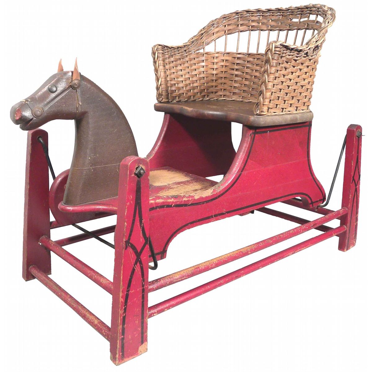 Hobby Horse w/Wicker Seat. Great Folk Art Piece. Swing motion. Original paint and pin stripping. Excellent condition. 30 X 24 X 15 inches.