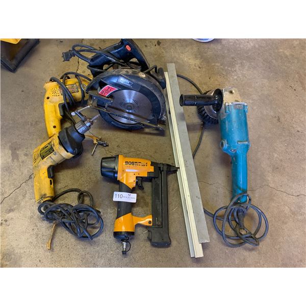 2 x 10mm VSR Drills, Grinder, Nail Gun, Air Nailer, 7 1/4" 2.25 HP Skilsaw, and 2 x Levels