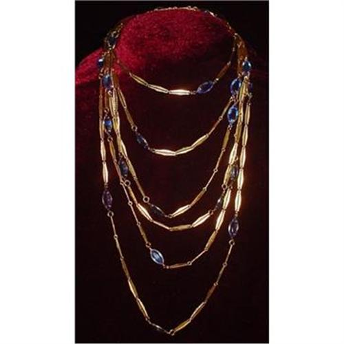 A Hobe' classic. This single strand of Gold Tone metal link features Blue Crystals interspaced every 6th link. A timeless piece, somewhat subdued by Hobe' standards, which remains striking nonetheless. The single strand measures 8 ft. in length and carries the makers mark.