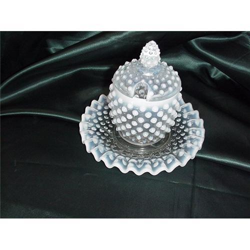 Opalescent Hobnail jelly Server with saucer. 6" in diameter. Jar is 3 1/4" in diameter x 5" tall. Condition is very good, no chips to any of the hobnails.