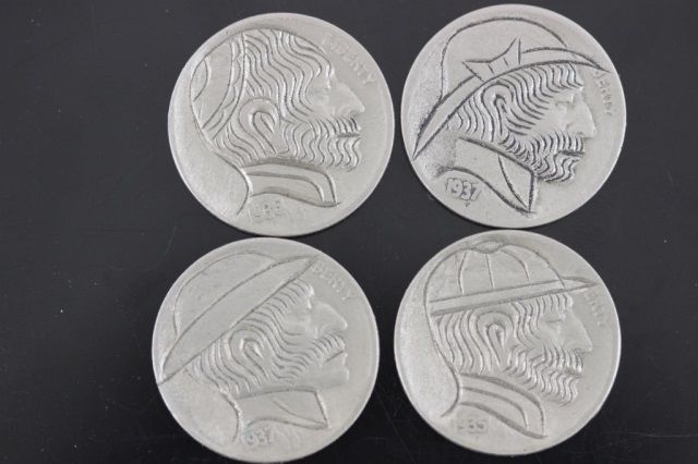 This lot is a collection of 4 "Hobo Nickels". These coins were Buffalo Nickels from 1935 to 1937 but have been carved with different designs on the obverse of each coin. These wonderful coins would make a fantastic addition to any collection.
