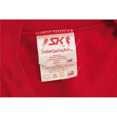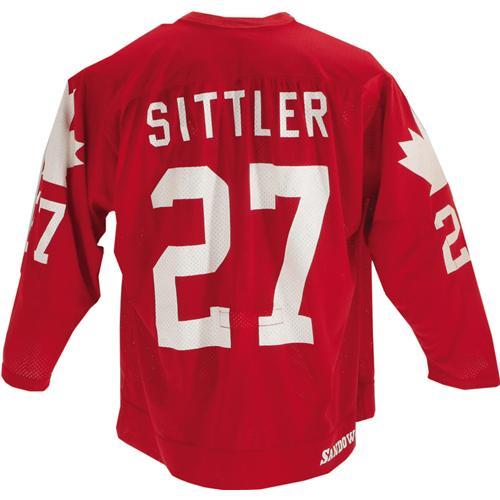 <B>1981 Darryl Sittler Canada Cup Game Worn Jersey.</B></I> With players like a very young Gretzky, Mike Bossy, Bryan Trottier and Guy Lafleur joining Sittler on the ice for this international tournament, Canada fielded perhaps the greatest Cup team of all time in 1981. This special red mesh sweater dates from the historic convergence of hockey legends, having seen action with Toronto Maple Leafs all-time leading scorer Sittler. "Canada" and maple leaf imagery is screened across the chest, with "Sittler 27" screened to verso. Each sleeve offers another number "27" and maple leaf design. "Sandow Sporting Knit" tagging in tail has handwritten size "48" notation. Fight strap in tail. Appropriate light wear. <I>LOA from Lou Lampson.</B></I><BR><BR><b>Shipping:</b> Clothing, Costumes & Jerseys (<a target="_blank" href="http://www.heritageauctions.com/common/shipping.php">view shipping information</a>) <BR><BR><B>Important no