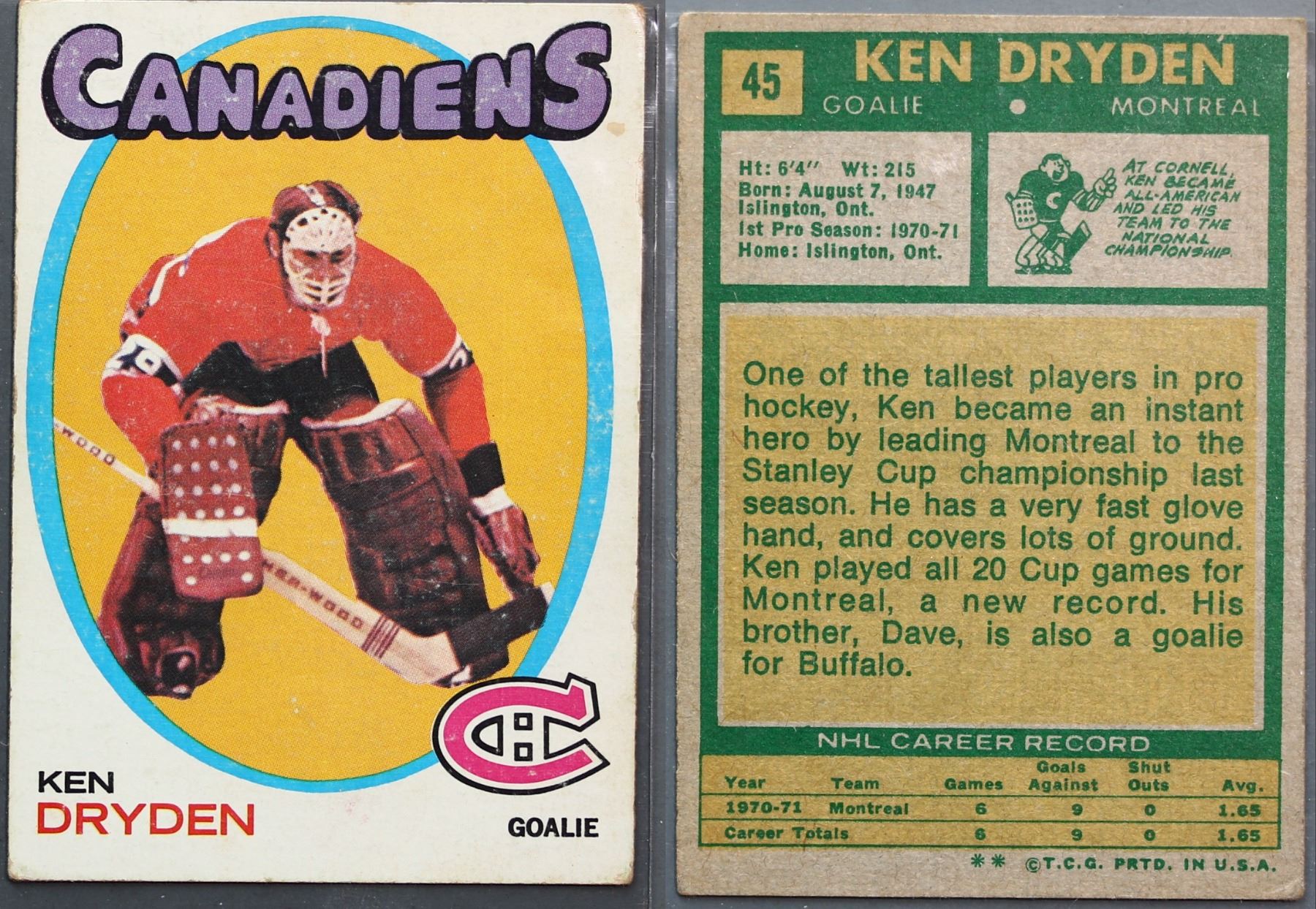 Hockey Card; Ken Dryden #45 1971 Topps Rookie Card. Nice example with decent borders and corners.