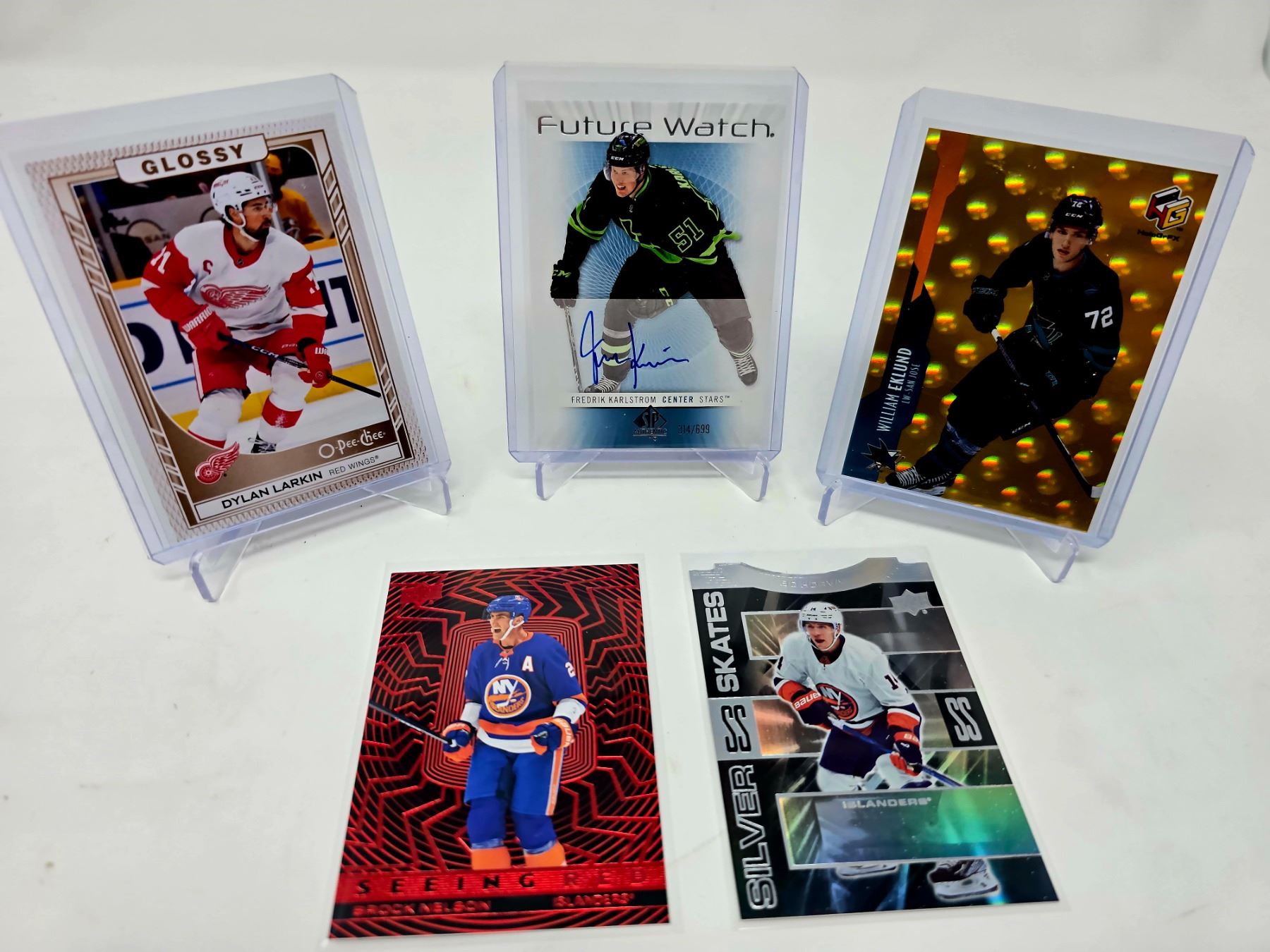 Six-card lot includes Frederik Karlsson Future Watch auto /999, Dylan Larkin Glossy, William Eklund Gold Rookie, and three New York Islanders inserts including Silver Skates.