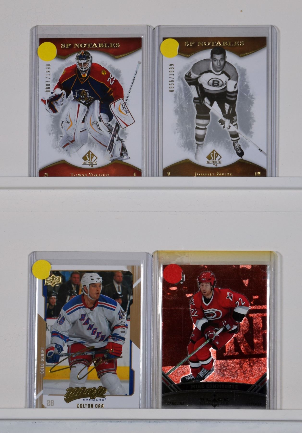 07-08 Tomas Vokoun SP Notables Card 0607/1999, 07-08 Johnny Bucyk SP Notables Card 0956/1999, 08-09 Colton Orr Upper Deck MVP Signed Card 023/100, 06-07 Mike Commodore Black Diamond Card 099/100
