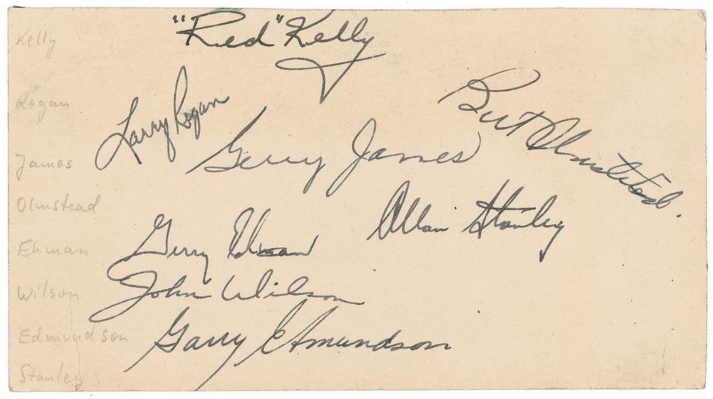 Vintage ink signatures of ‘Red’ Kelly, Larry Rogan, Gerry James, Gerry Ehman, John Wilson, Garry Edmundson, Allan Stanley, and Bert Olmstead on an off-white 6.5 x 3.5 card. In fine condition, with pencil notations along left edge, a few minor creases, and a bit of light soiling. RRAuction COA.
