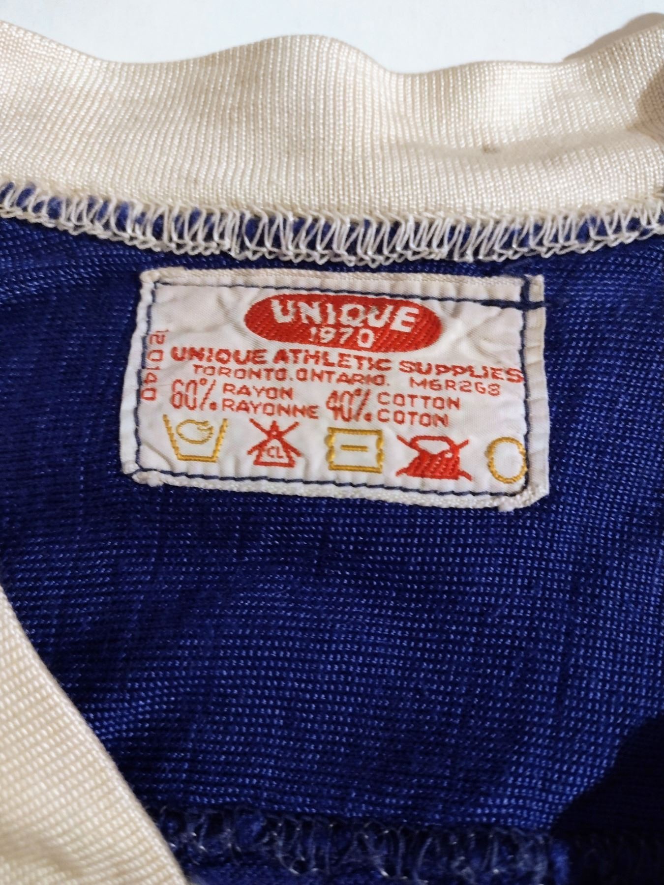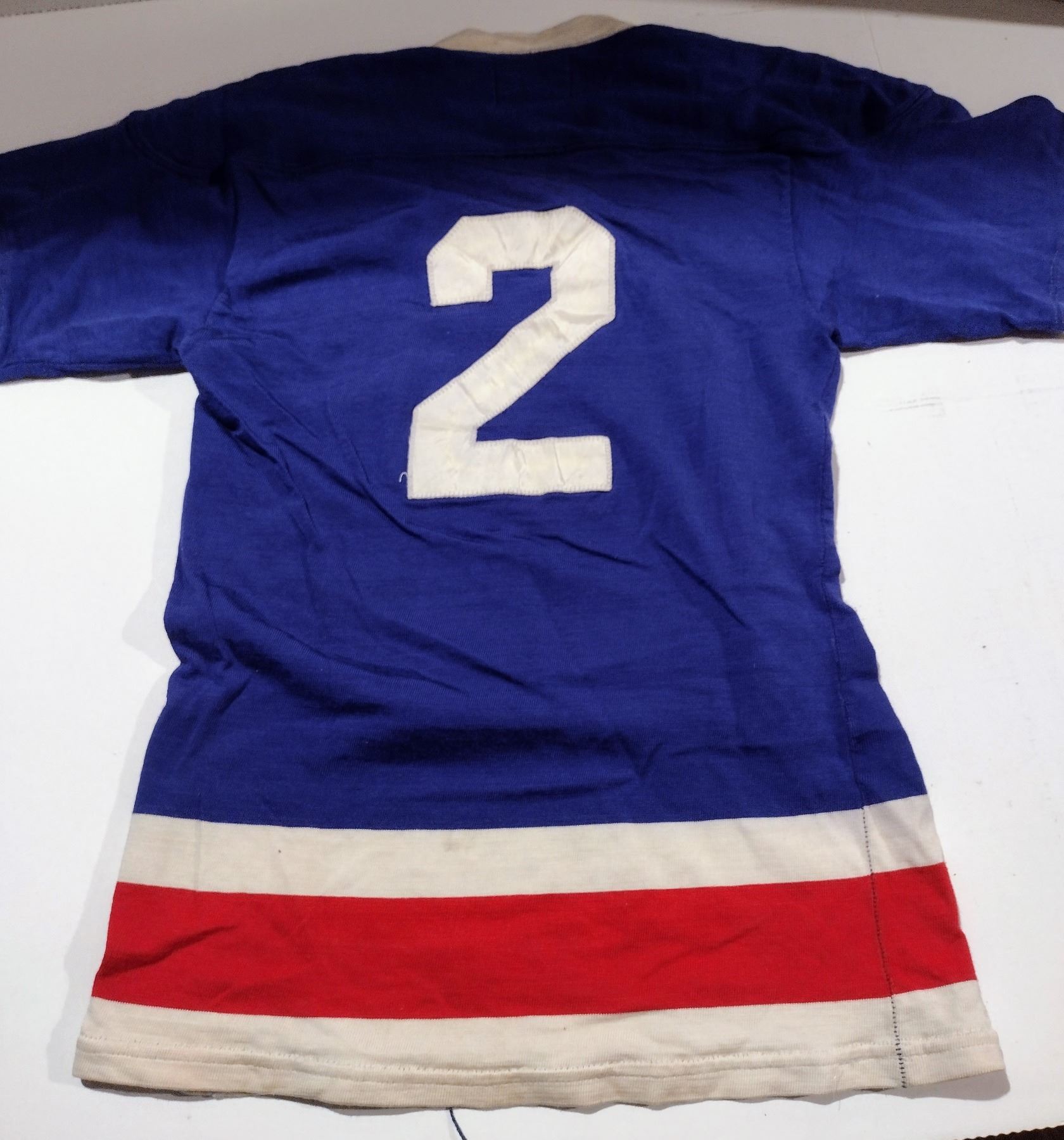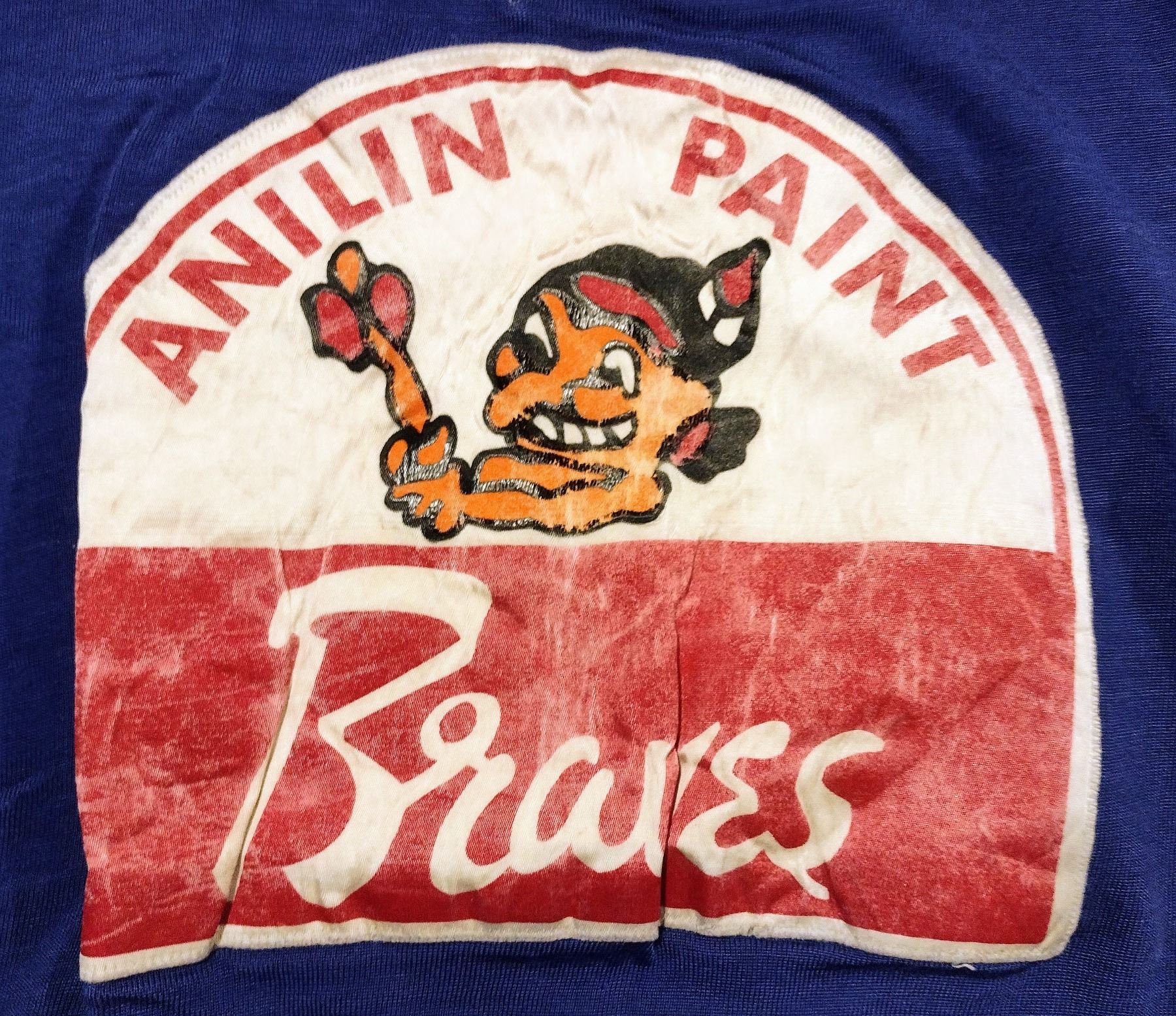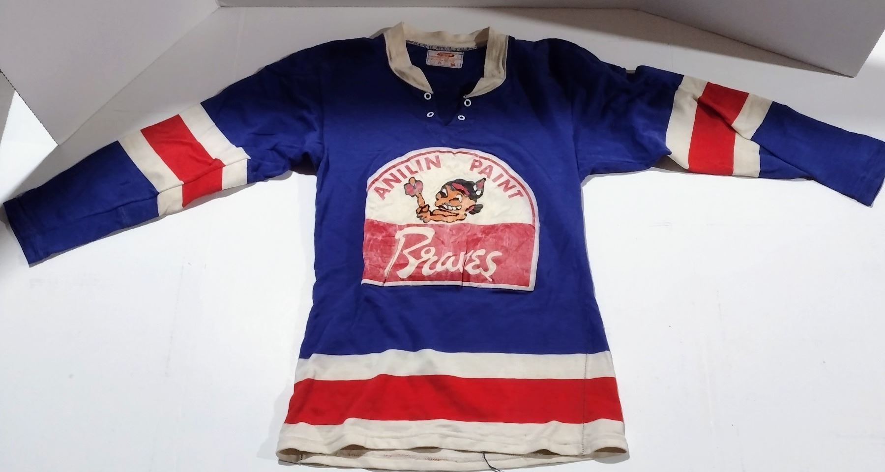 Hockey sweater with a what appears to be a First Nation brave. The crest says “Anilin Paint Braves.” This is a child’s hockey jersey from the 1970’s.