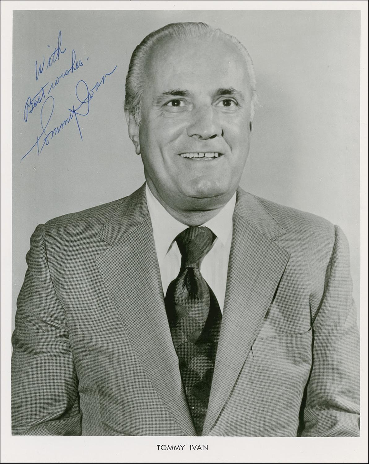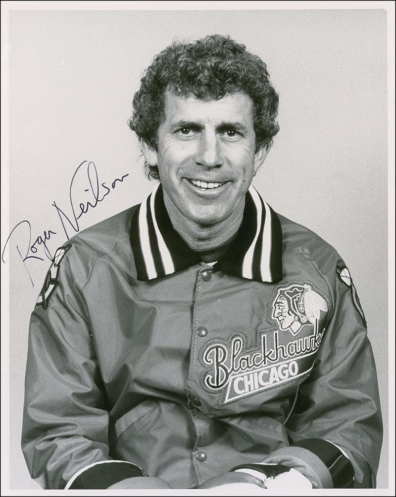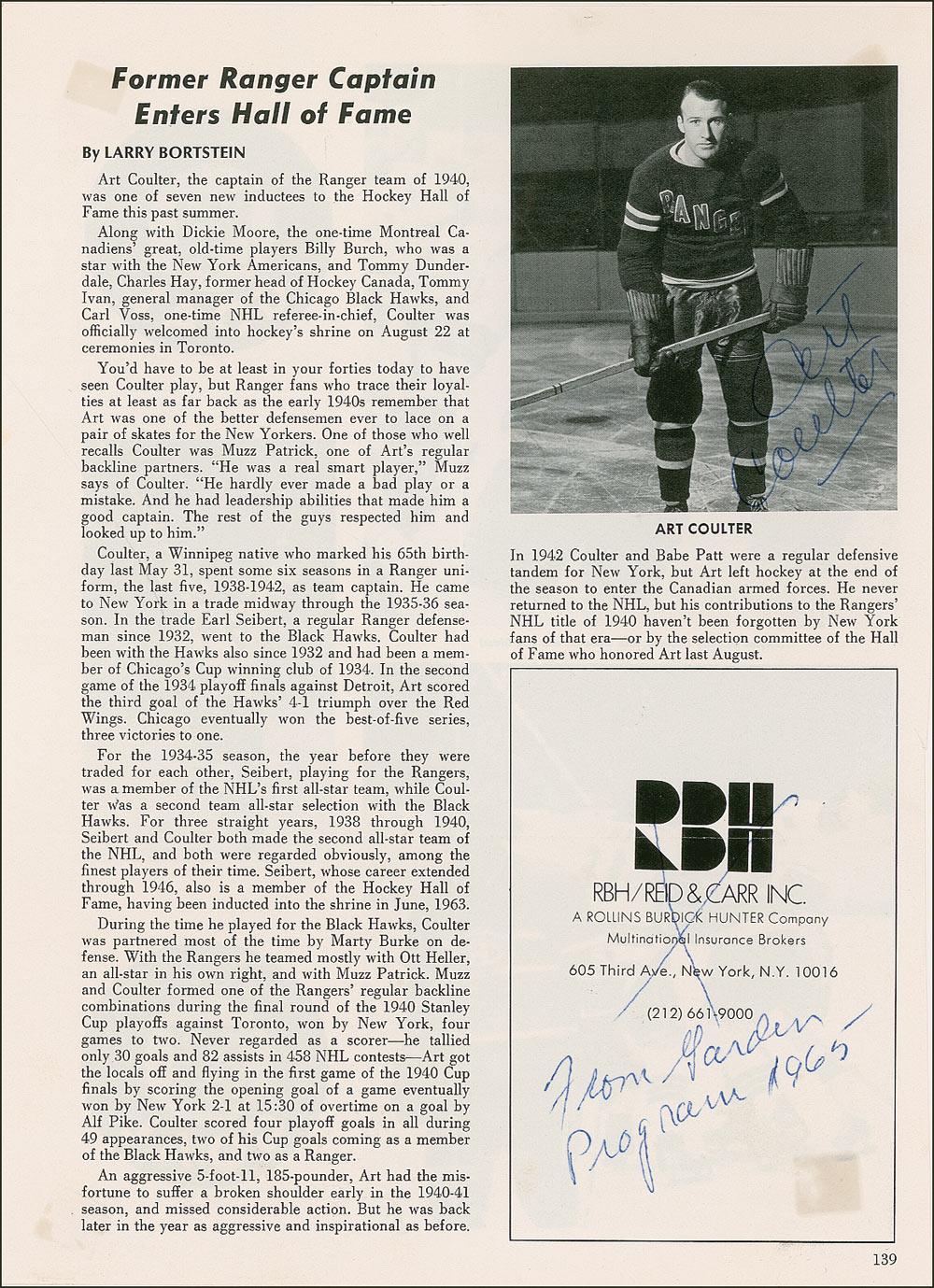 Three items: two 8 x 10 glossy photos, one of Tommy Ivan signed in blue ballpoint and one of Roger Neilson signed in black felt tip; and a hockey book page, 8 x 11, featuring a photo and article on Art Coulter, signed in blue ballpoint and affixed to a slightly larger sheet. In very good condition, with scattered creases, dings and impressions to photos, light staining to one photo, and intersecting folds and toning to program page.