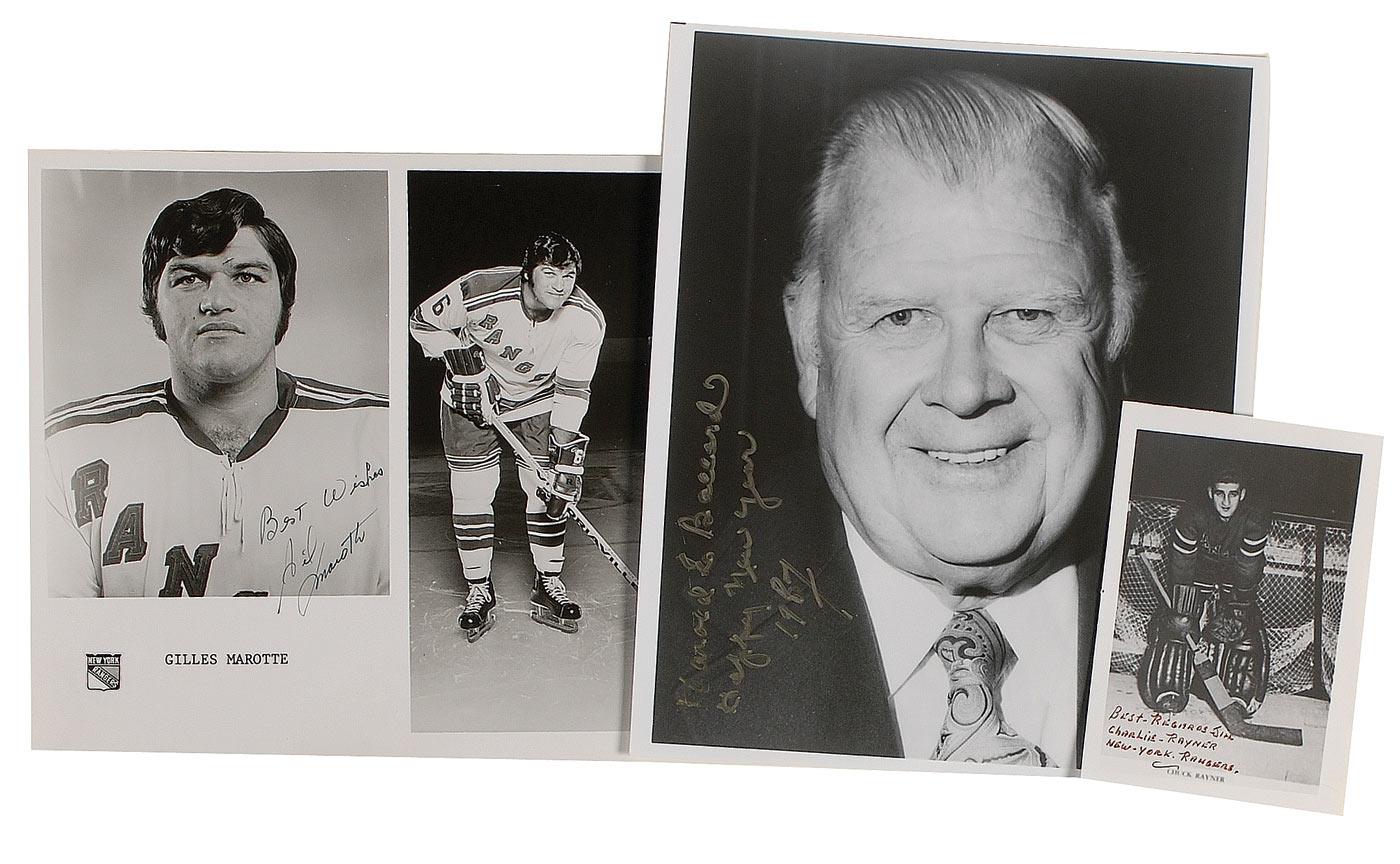 Three glossy photos, ranging in size from 3.5 x 5 to 10 x 8, each signed in ink or felt tip by the respective player or executive pictured. Signers are: Harold Ballard, Gilles Marotte, and Chuck Rayner (ins). In overall fine condition.