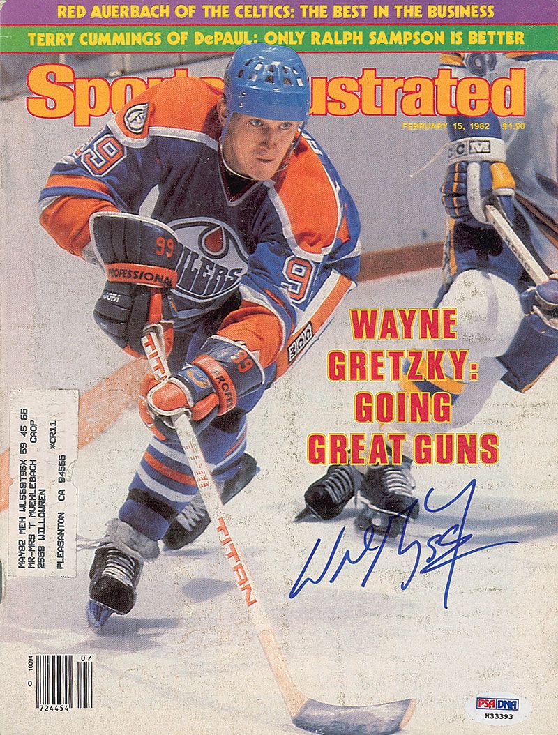 Two issues of Sports Illustrated, each signed by the hockey great(s) pictured: one featuring Wayne Gretzky on the cover, dated February 15, 1982, signed in blue felt tip; and one featuring Gordie Howe and Ted Lindsay on the cover, dated March 18, 1957, signed in blue felt tip by both. In overall fine condition, with general wear to the Red Wings magazine and a PSA/DNA label affixed to the lower right corner of the Gretzky magazine. Accompanied by a certificate of authenticity from PSA/DNA for the Gretzky.