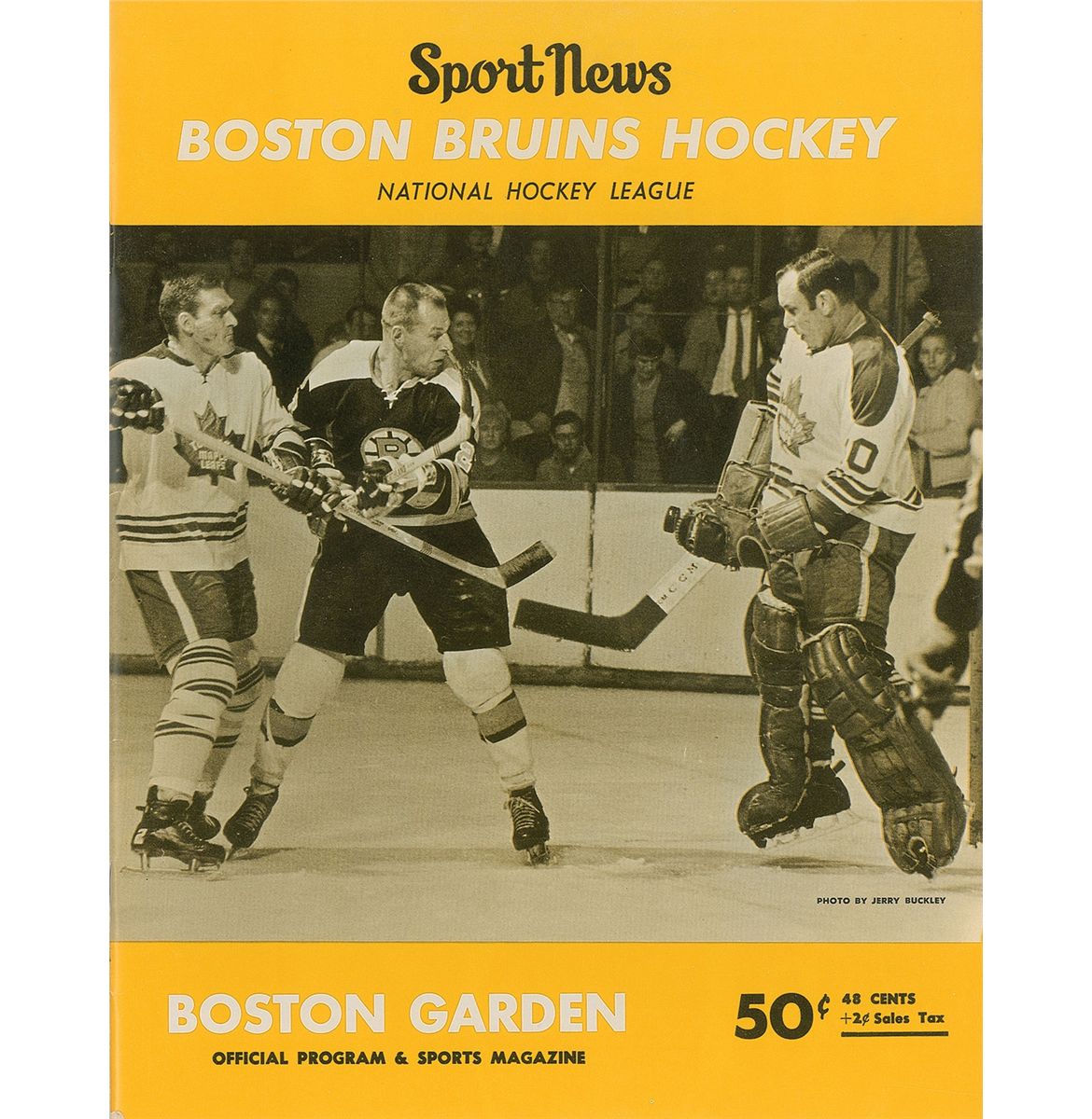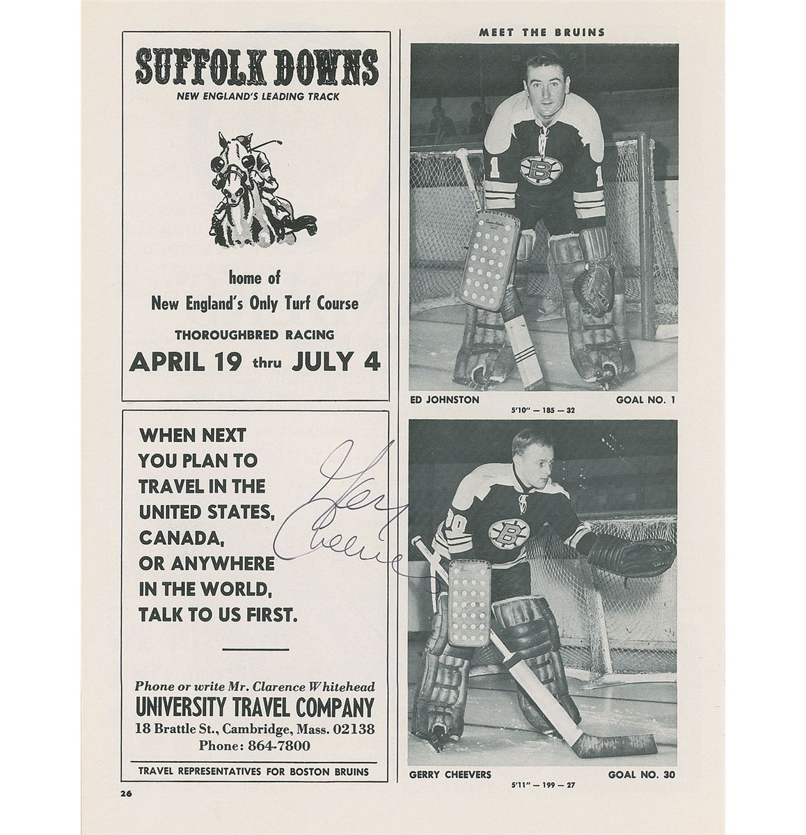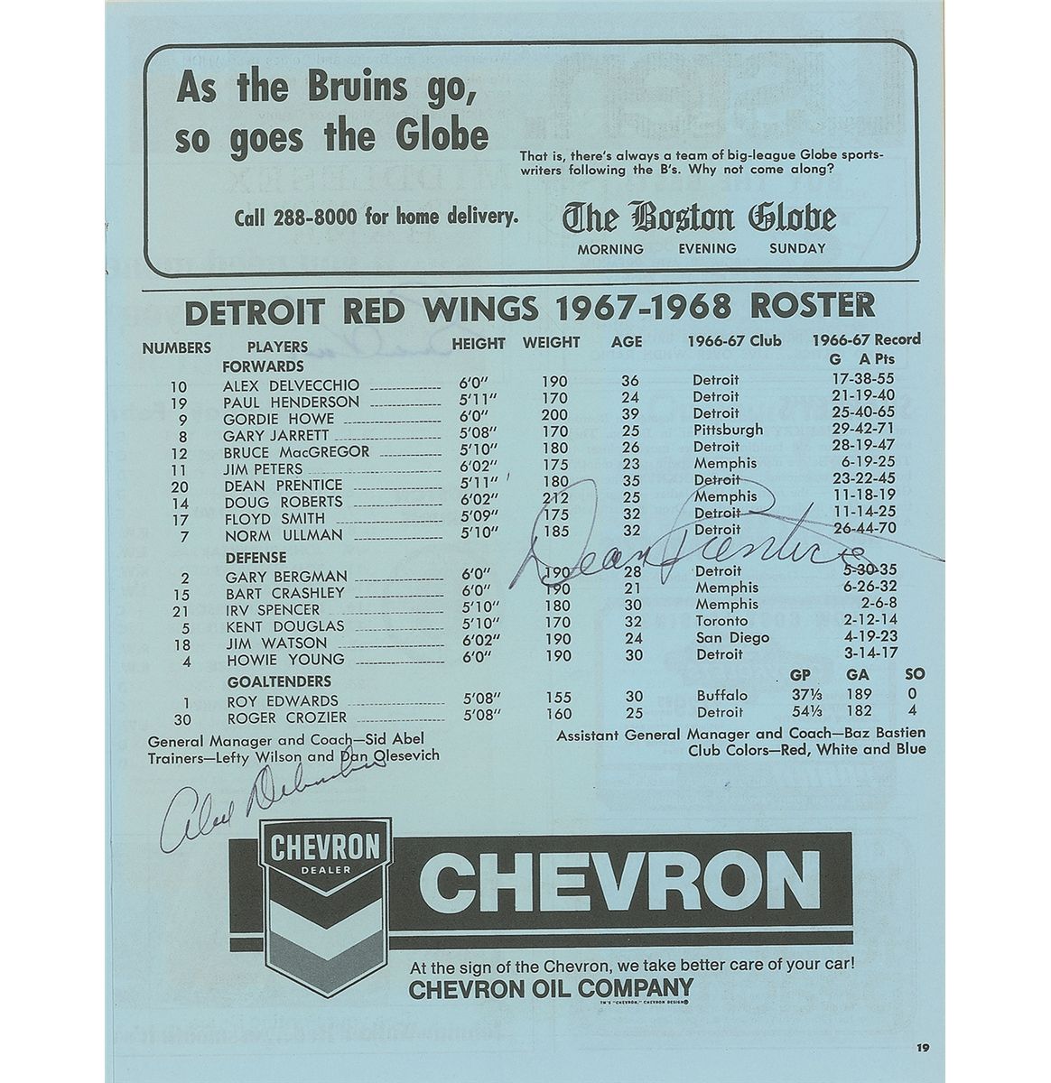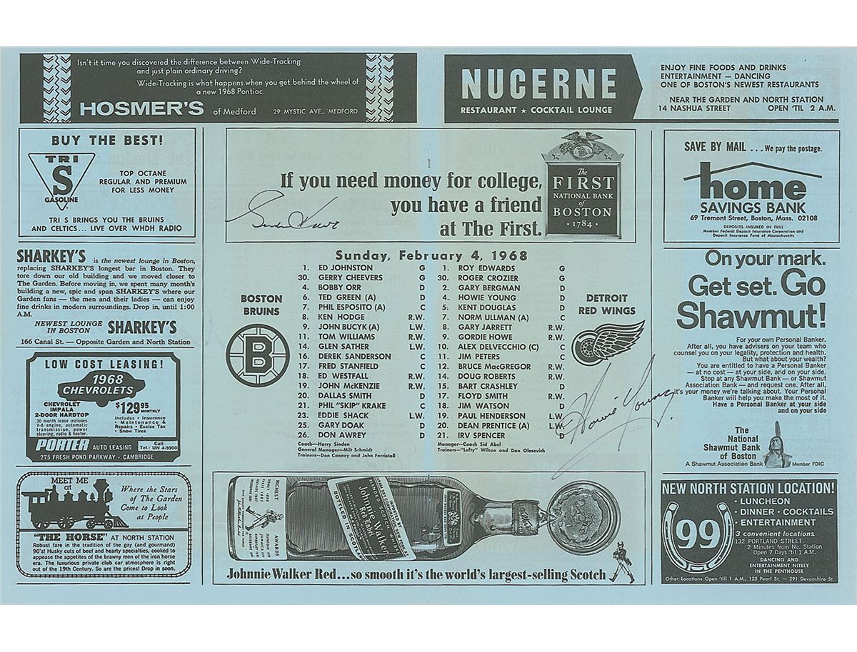 Program for the Boston Bruins vs. Detroit Red Wings hockey game on February 4, 1968, 8.5 x 11, 40 pages, signed inside by eight players, including four from each team. Signers are: Alex Delvecchio, Dean Prentice, Gordie Howe, Howie Young, Gerry Cheevers, Glen Sather, John McKenzie, and Gary Doak. The scorecard inside was filled out in ballpoint by the fan in attendance. In fine condition. The Bruins won 5–4, led by a hat trick from John McKenzie.